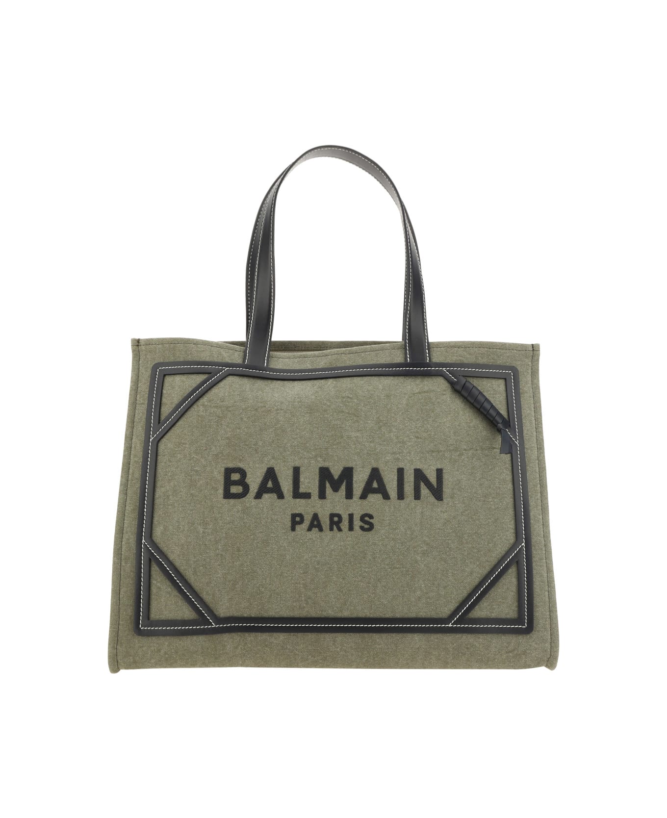 Cotton b-army shopping bag by balmain, contrasting leather trim and details, double flat leather top handles, iconic brand monogram printed in contrasting color on the front, interior welt pocket.
