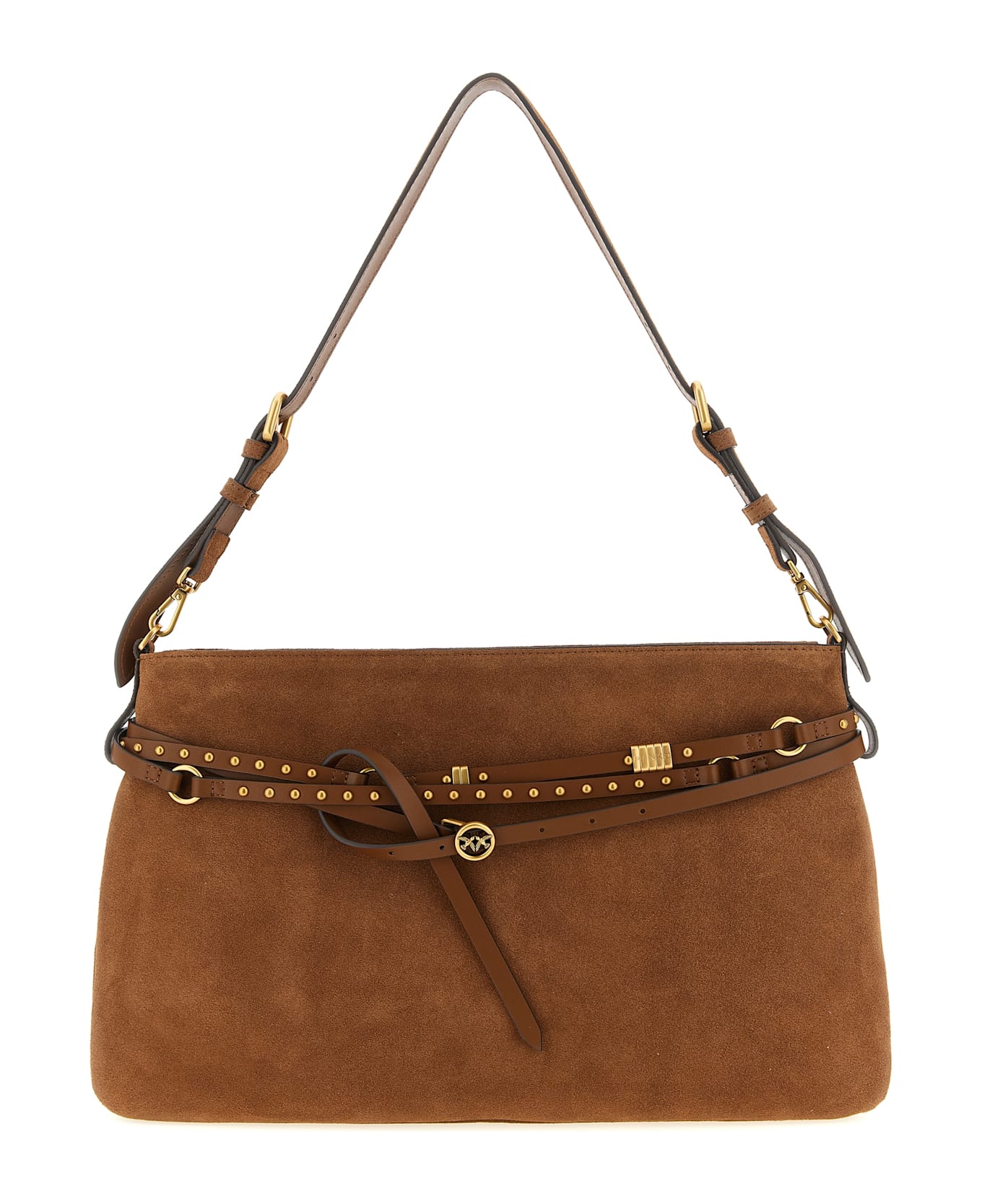 Large suede 'Belt' shoulder bag with two bellows construction, smooth leather belt detail with studs and removable metal 'Love Birds Diamond Cut' logo, top zip closure, adjustable and removable handle.