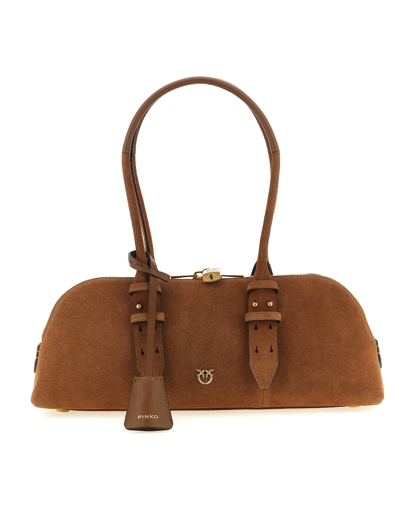 Bowling Baguette' large suede shoulder bag, metal 'Love Birds' logo on the front and embroidered back, double adjustable handle, top zip closure with padlock detail, rigid base with metal feet, adjustable and removable shoulder strap.