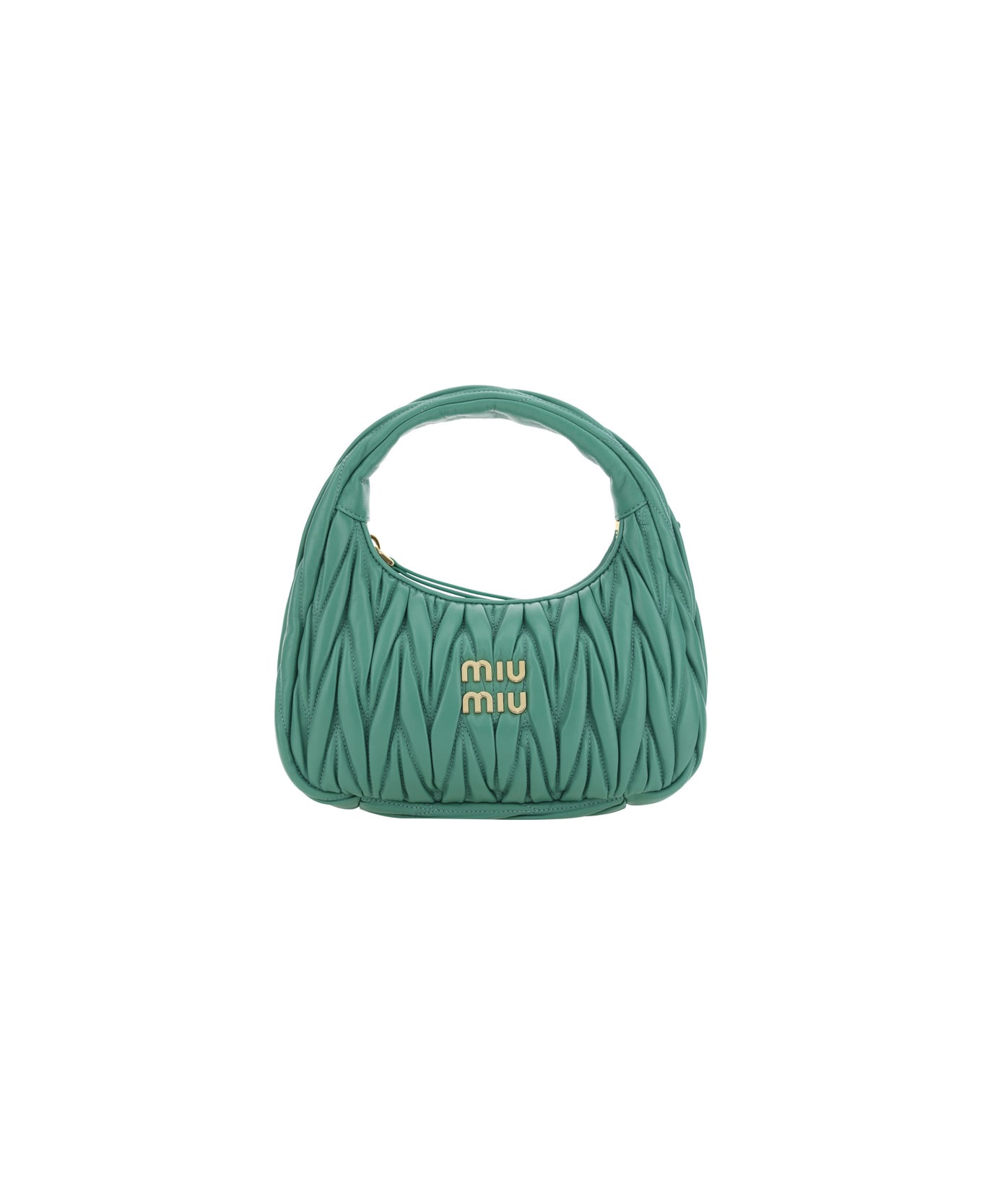Lambskin handbag by miu miu, matelassé effect, iconic brand monogram applied in contrast embossed on front, top zipper closure, main compartment, iconic brand logo plaque applied inside.