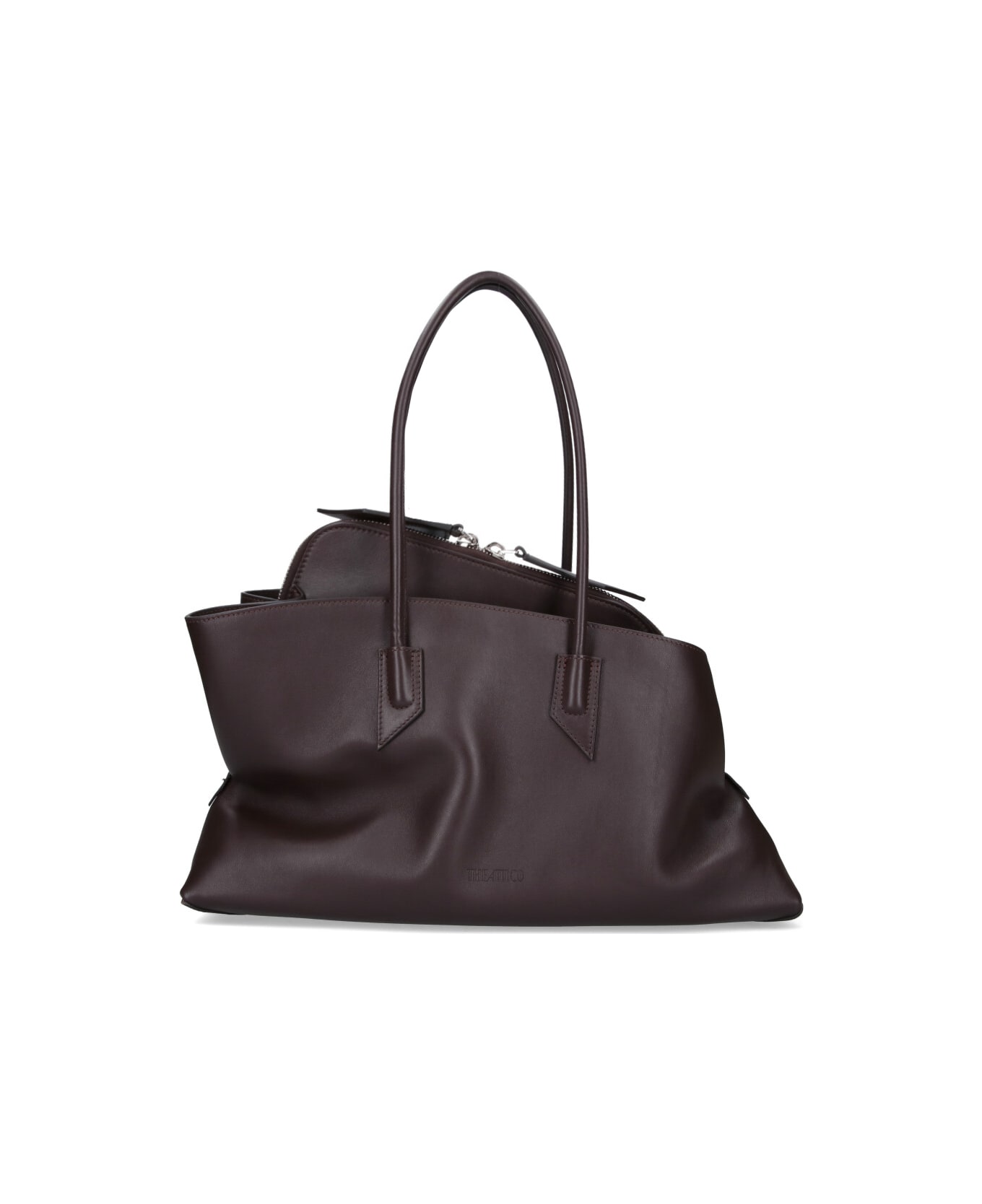 The Attico 'La Passeggiata' medium shoulder bag in brown leather with two top handles, double zip closure, tonal logo on the front, three main inner compartments, one inner card slot.