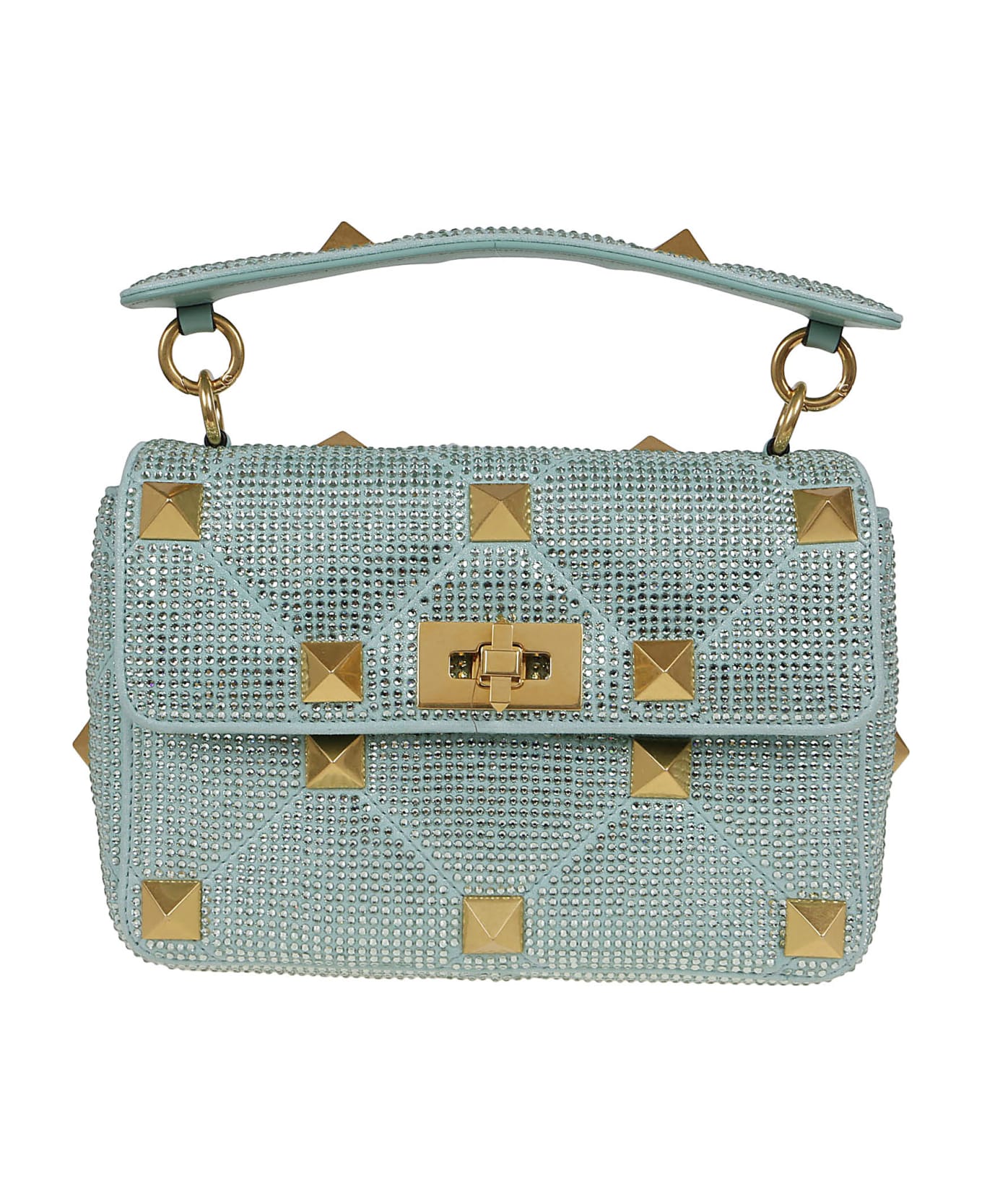 Medium bag with Roman Stud chain entirely covered in rhinestones BY VALENTINO GARAVANI. In nappa lambskin. Characterized by quilted nappa leather with rompi texture with tone-on-tone stitching and decorated with maxi studs, characteristics of the brand in an antiqued brass color like the other metal parts. Turn lock; inside pocket with zip and two flat open pockets. The bag can be worn both on the shoulder and by hand thanks to the removable handle and the sliding and removable chain. Ideal for an elegant and feminine outfit both with the matching flat or décolleté from the Roman Stud collection, or with sneakers!