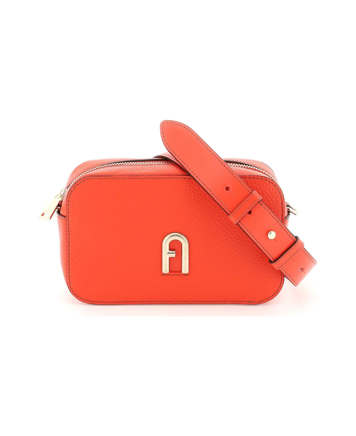 Camera bag Primula by Furla made of grained leather and Arco logo applied on the front. Zipper closure, ribbed fabric interior with one open flat pocket and one zipper pocket with logo patch. Adjustable and removable shoulder strap. Gold-finished metalware.