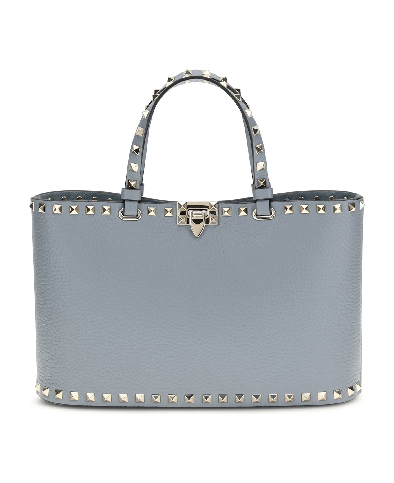 The rockstud small tote bag by valentino garavani is crafted from leather and finished with the brand s iconic studded rockstud edging. the design features double leather handles, a removable and adjustable leather shoulder strap, a metal hook closure, and an internal leather pocket. a sophisticated and distinctive piece that blends elegance with signature detailing.