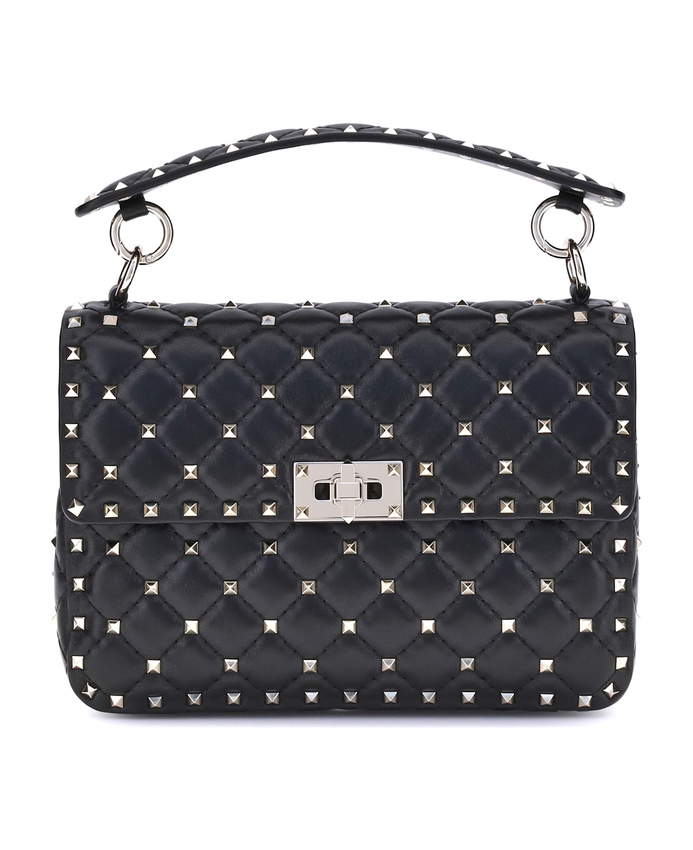 The rockstud spike shoulder bag by valentino garavani is crafted from soft lambskin nappa with a diamond-quilted design and iconic small studs. featuring a removable handle and sliding, removable chain, it can be carried by hand, over the shoulder, or cross-body. the flap with twist lock closure, studs, and platinum-finish hardware, along with the nappa lining and internal red leather zip pocket, make this bag elegant and versatile.