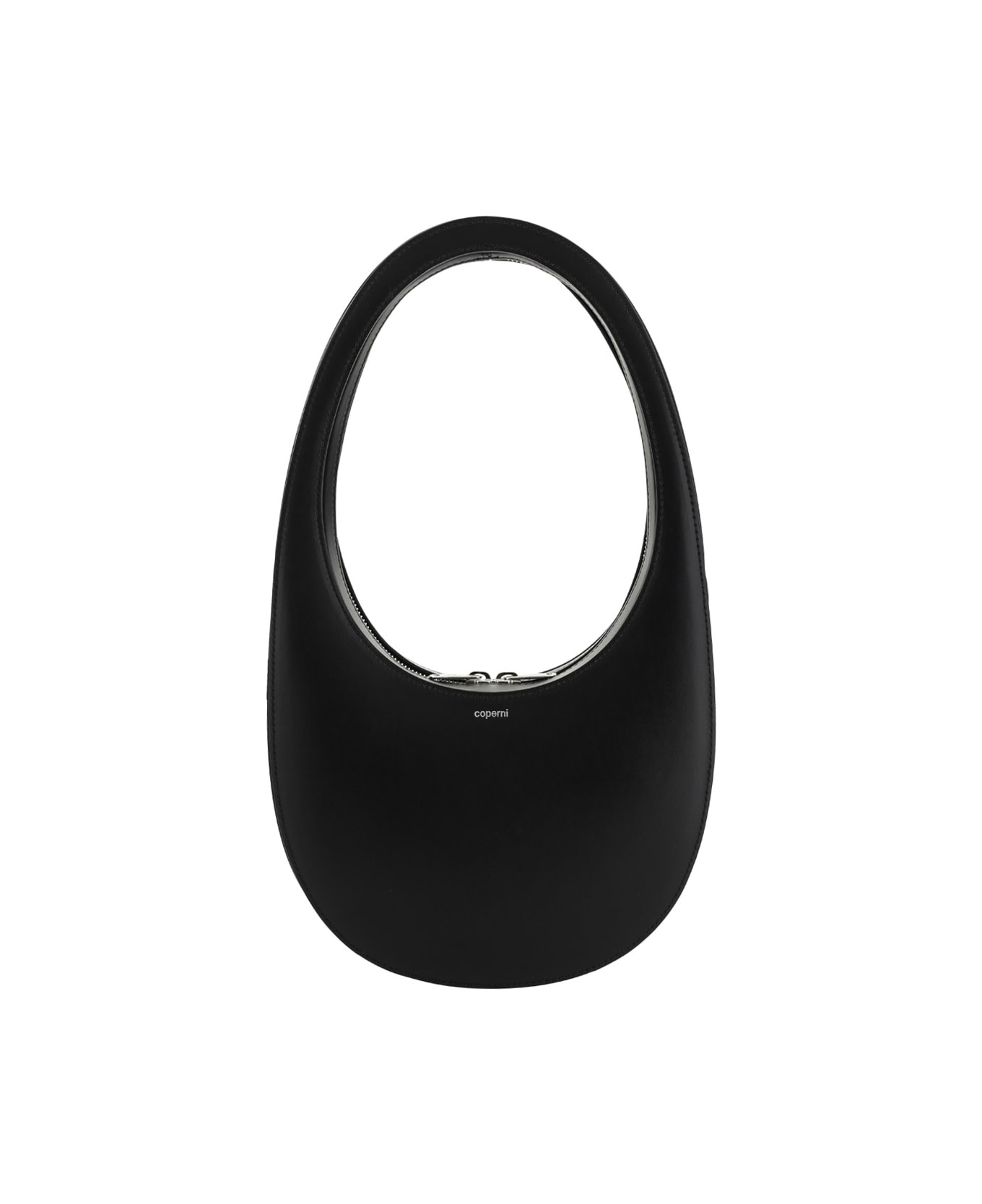 Calfskin shoulder bag by coperni, unique design, hobo shape, double-slider zipper top closure, single interior compartment, iconic three-dimensional brand monogram plaque embossed on contrasting front, removable and adjustable flat shoulder strap, interior welt pocket.