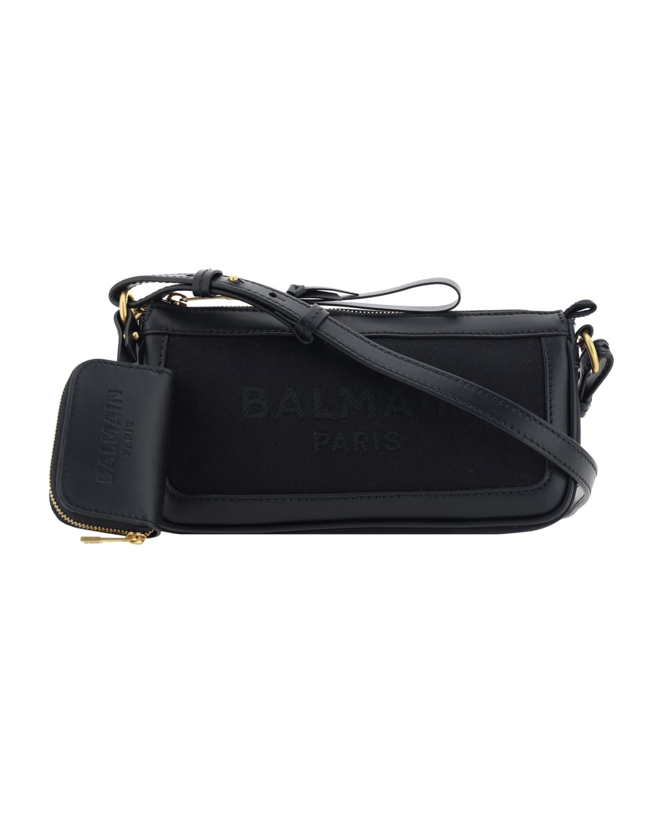 Cotton shoulder bag by balmain, zipper top closure, adjustable leather shoulder strap, leather inserts, iconic tone-on-tone embroidered brand monogram on front, matching removable pouch, removable chain as handle, monochrome pattern.