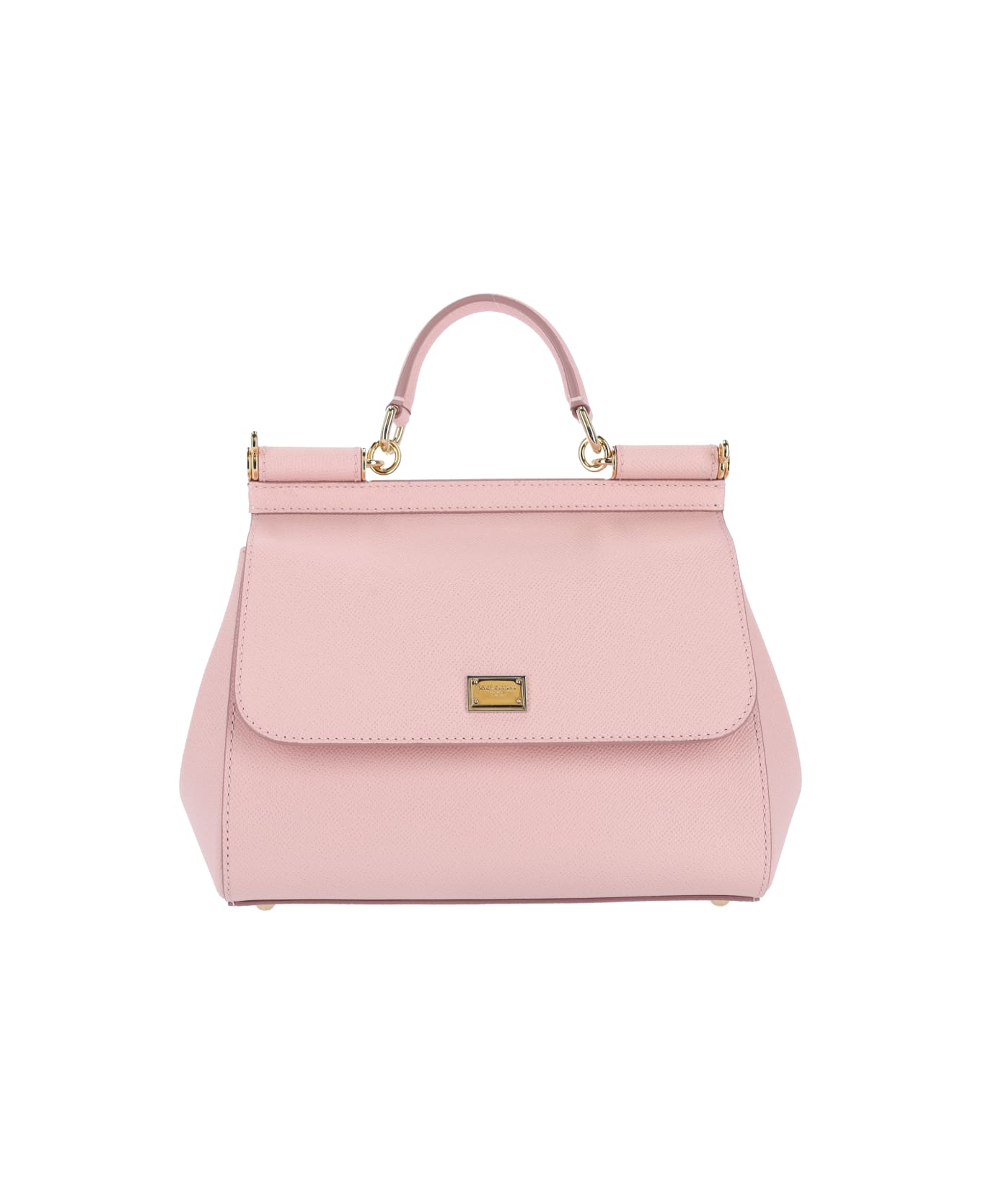 Dolce & Gabbana 'Sicily' large handbag in pink calf leather with top handle, adjustable and removable shoulder strap, magnetic closure, gold metal logo hardware on the front, inner zip pocket, main entire compartment.