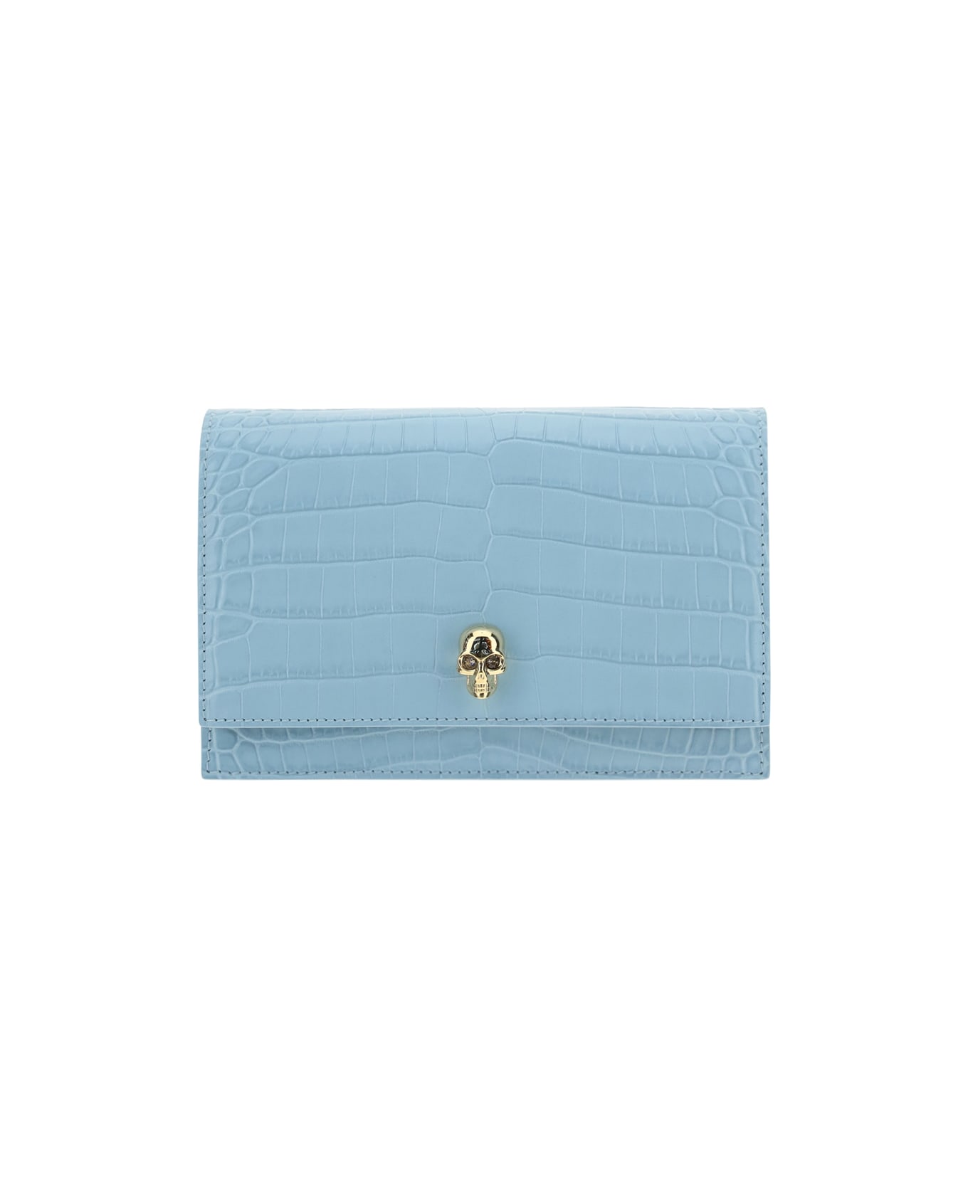Calfskin skull mini shoulder bag by alexander mcqueen, crocodile-effect leather, patent leather design, chain shoulder strap, magnetic front closure, iconic skull plaque applique on front, iconic contrasting brand signature on back, interior welt pocket.