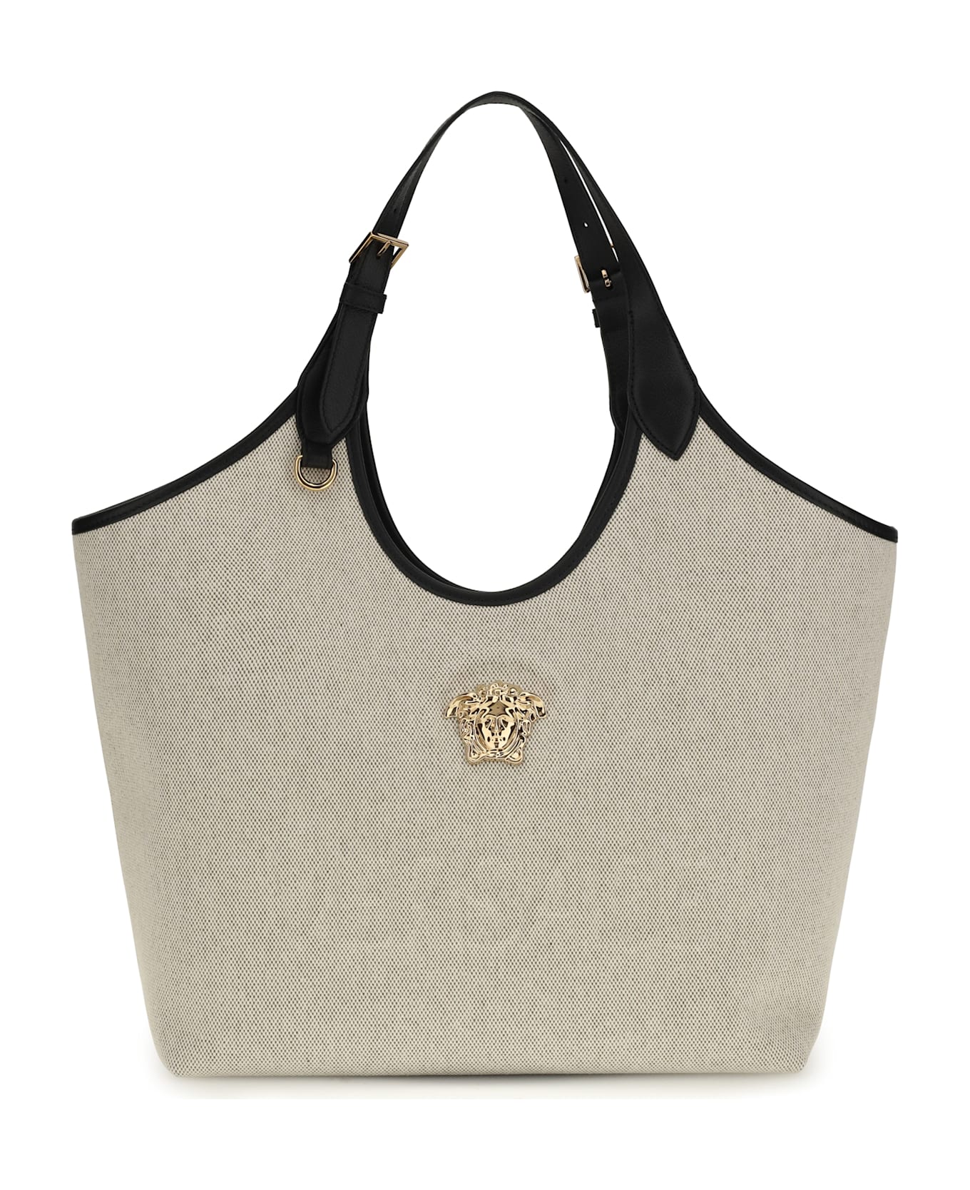 The la medusa tote bag by versace is a sophisticated and distinctive accessory, featuring embossed "versace" lettering and the iconic la medusa logo. the adjustable double handles offer comfort and practicality, while the interior features a zippered pocket for organizing essentials. an internal protective strap adds an extra touch of functionality, making this bag not only stylish but also perfect for everyday use.