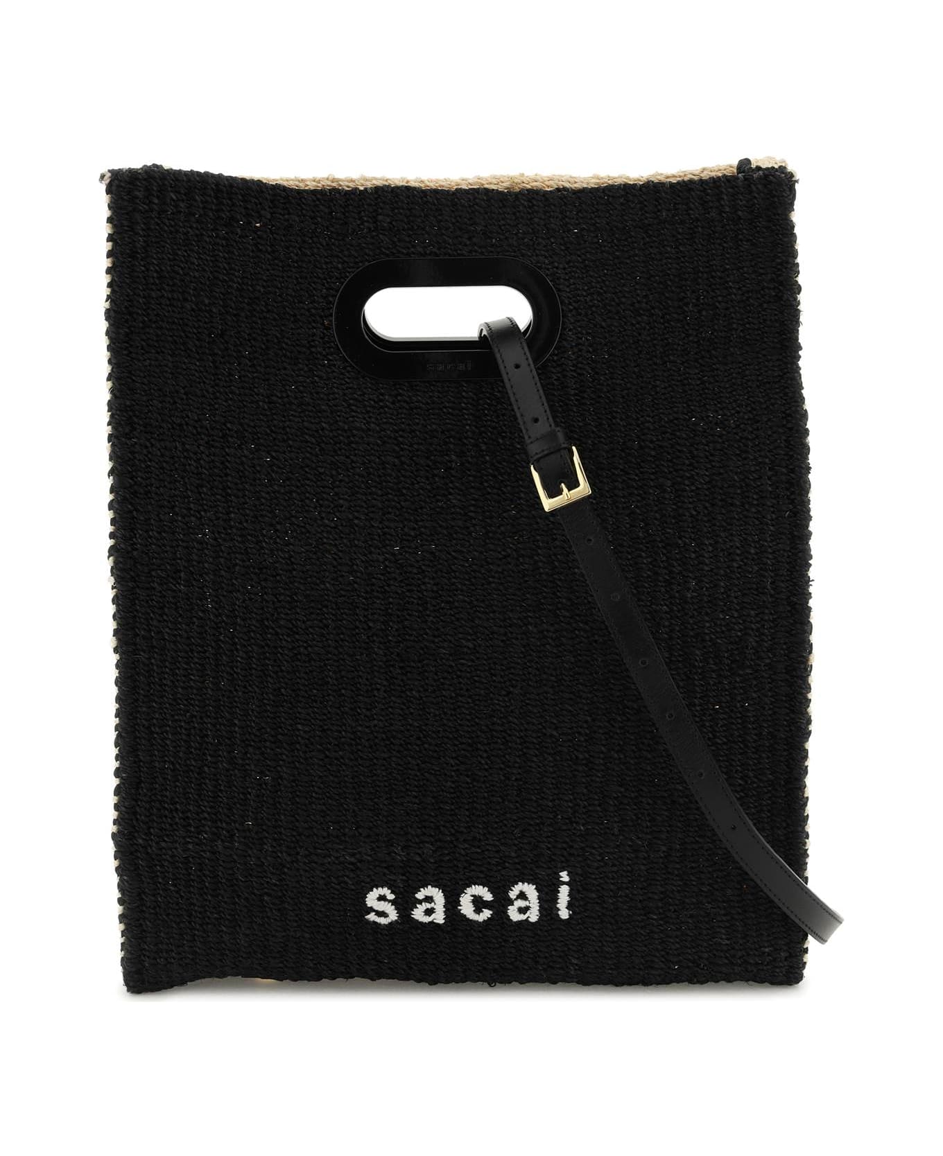 Sacai tote bag crafted in woven abaka with contrasting lettering logo, built-in metal handles, unlined interior with one open pocket, and adjustable, detachable leather shoulder strap. Gold-finished metalware.