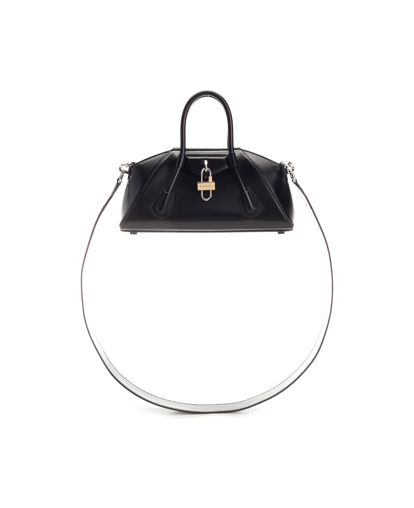 Black "Antigona" handbag from Givenchy in smooth leather, magnetic closure, triangular application with gold and silver-finish GIVENCHY padlock, two handles and one removable shoulder strap with embossed 4G motif, one main compartment with one GIVENCHY embossed flat pocket and one pocket with zip.