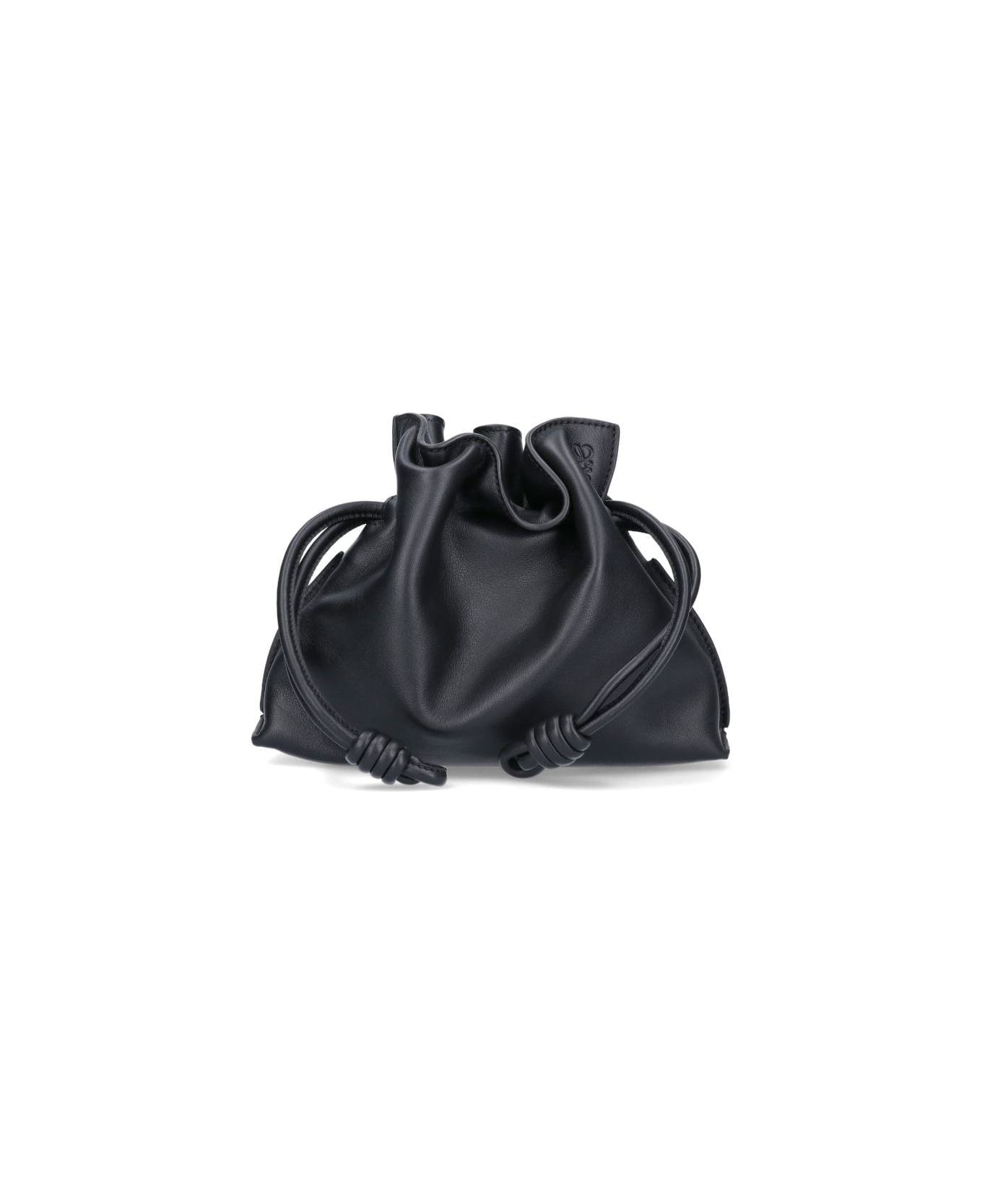 Loewe 'Flamenco' Mini Pouch, leather, black colour, magnetic closure, drawstring detail, adjustable and removable shoulder strap, engraved logo detail on front.