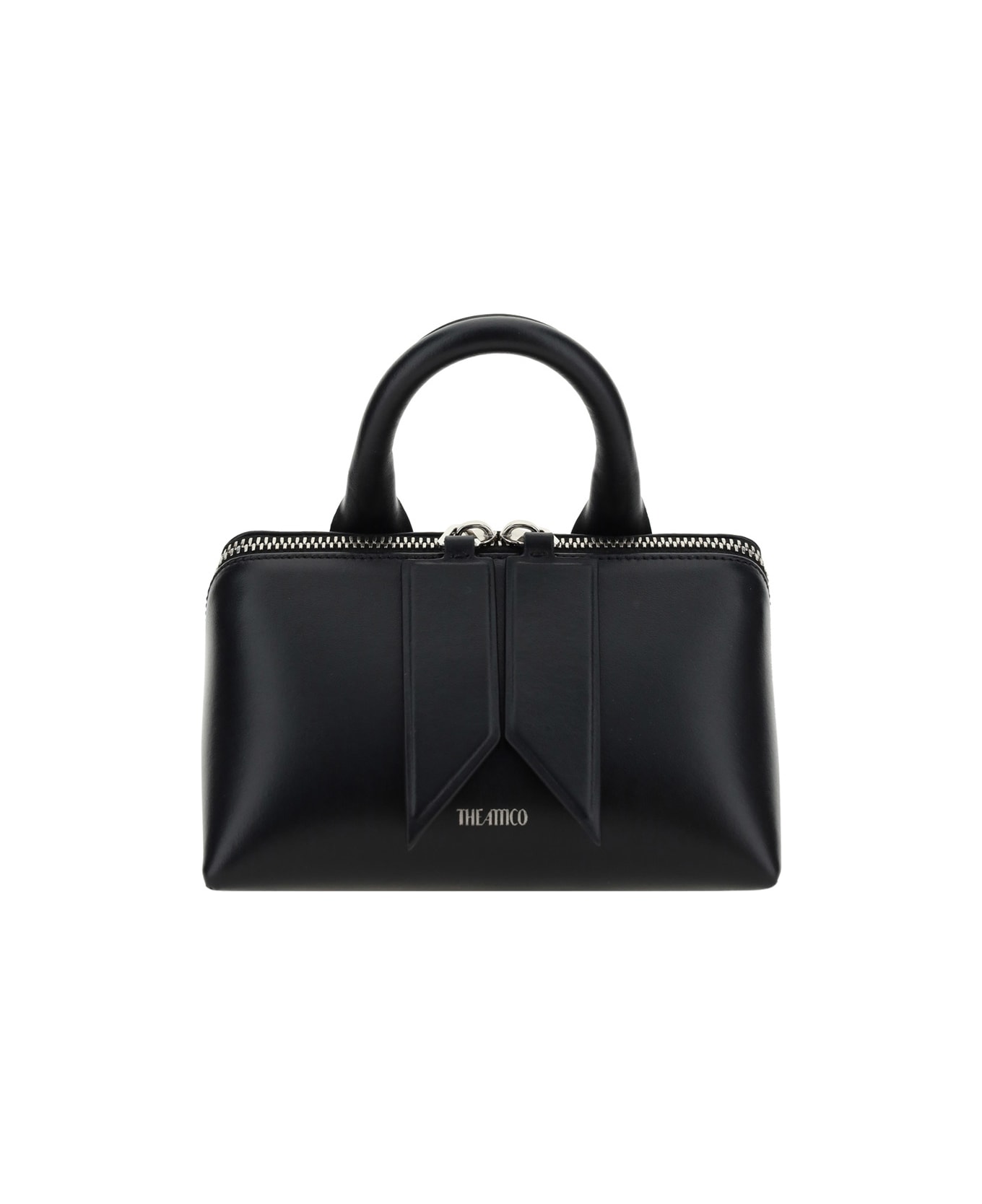 Calfskin friday mini handbag by the attico, removable and adjustable flat leather shoulder strap, geometric shape, asymmetrical top zipper closure, double geometric pull, iconic brand monogram in contrasting pressure on front, single top stiff handle, interior flat pocket, protective metal feet on base of bag.
