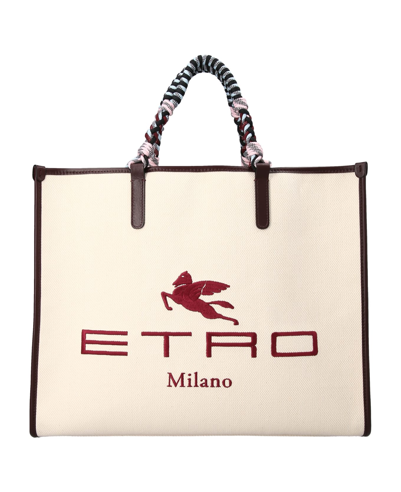 Globetrotter' canvas shopping bag with front embroidered logo, double multicolor cord handle and leather details.