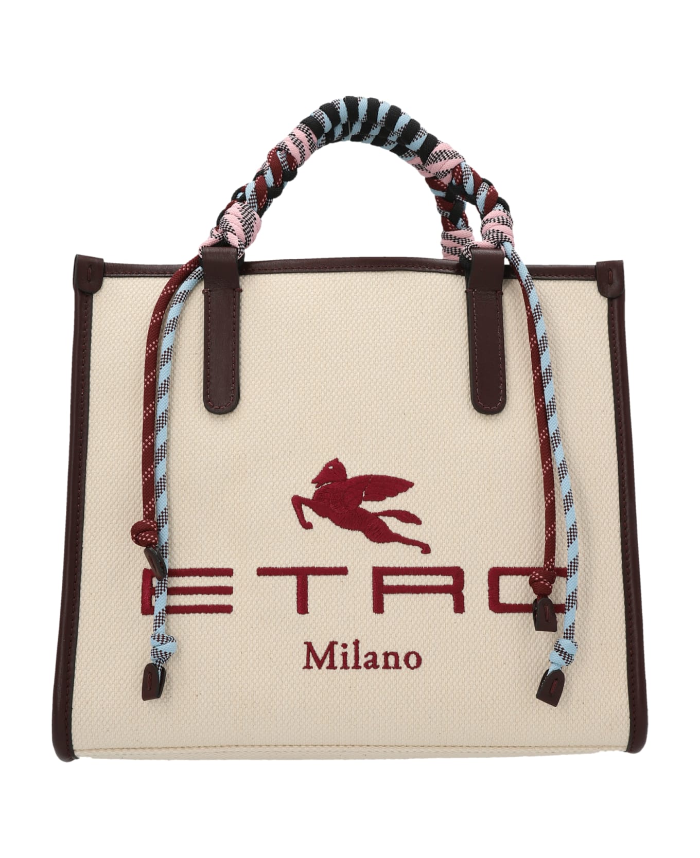 'Globetrotter' small shopping bag in cotton canvas with leather details, front logo embroidery, weaved handles, inner zip pocket, metal hardware. cessories.
