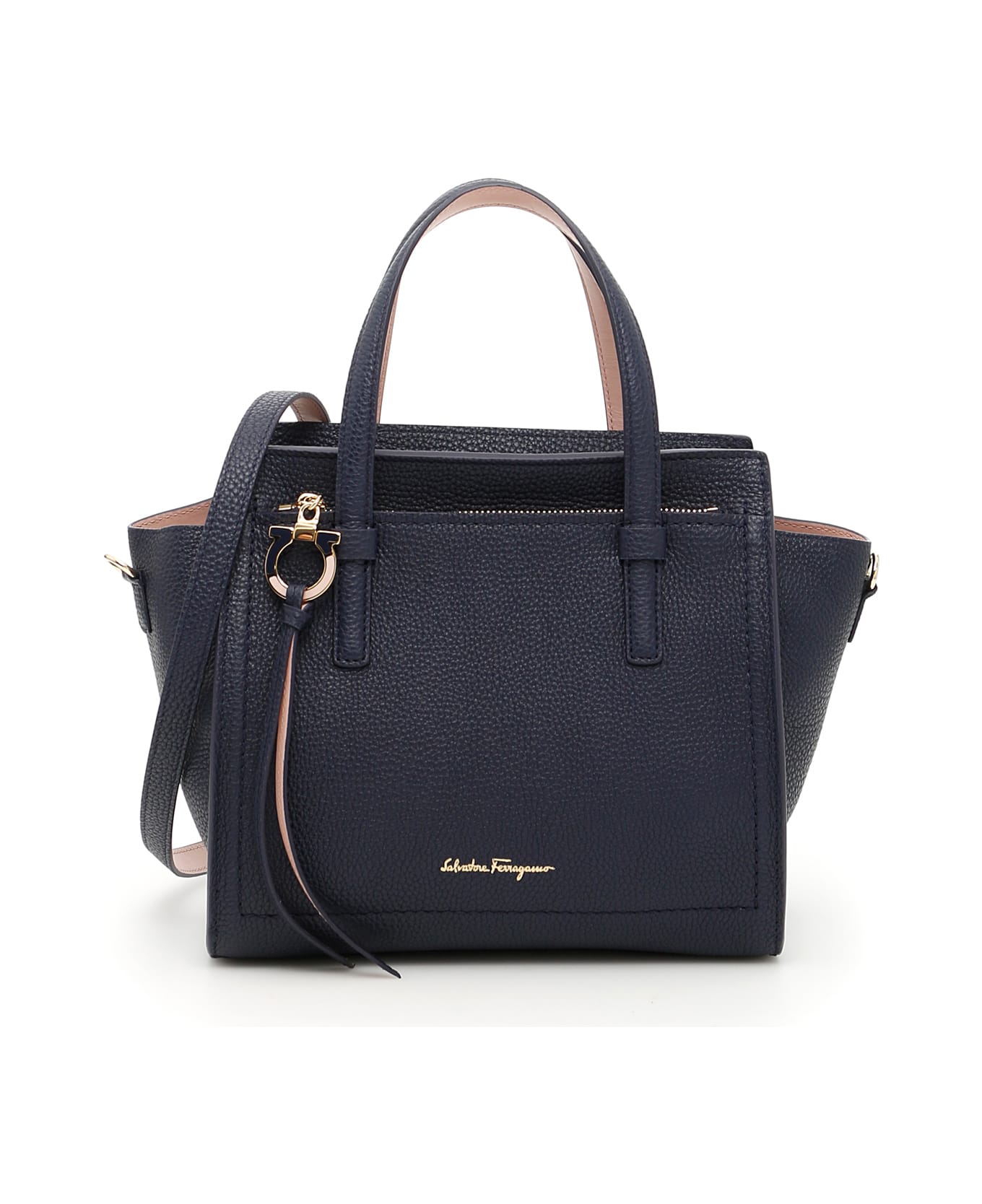 Salvatore Ferragamo grain leather bag with bicolor double handle and removable and adjustable strap. Zip closure, front zip pocket with metal and enamel Gancio zip puller with bicolor leather strap. Gold-printed logo, contrast leather lining, inside zip pocket. Gold-tone metal base protective studs and hardware.