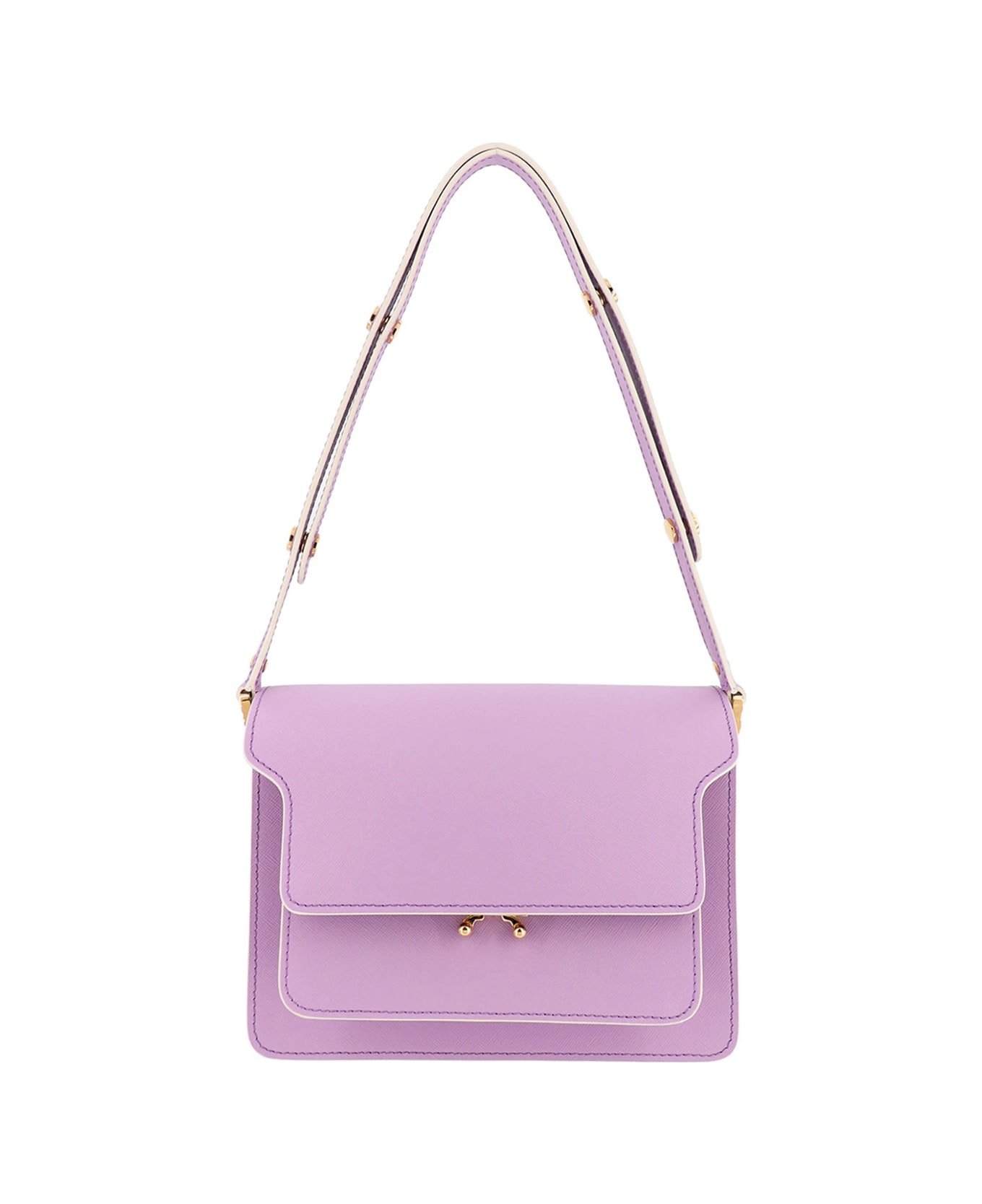 Lilac Trunk medium bag by Marni made of shiny calf leather and featuring fabric lining, a push-lock closure, gold-tone metal hardware, a back pocket, contrasting painted edges and tone-on-tone stitching. Inside: one flat pocket and five main compartments, two of which are zipped. Model with adjustable leather shoulder strap for carrying the bag on the shoulder or cross-body.