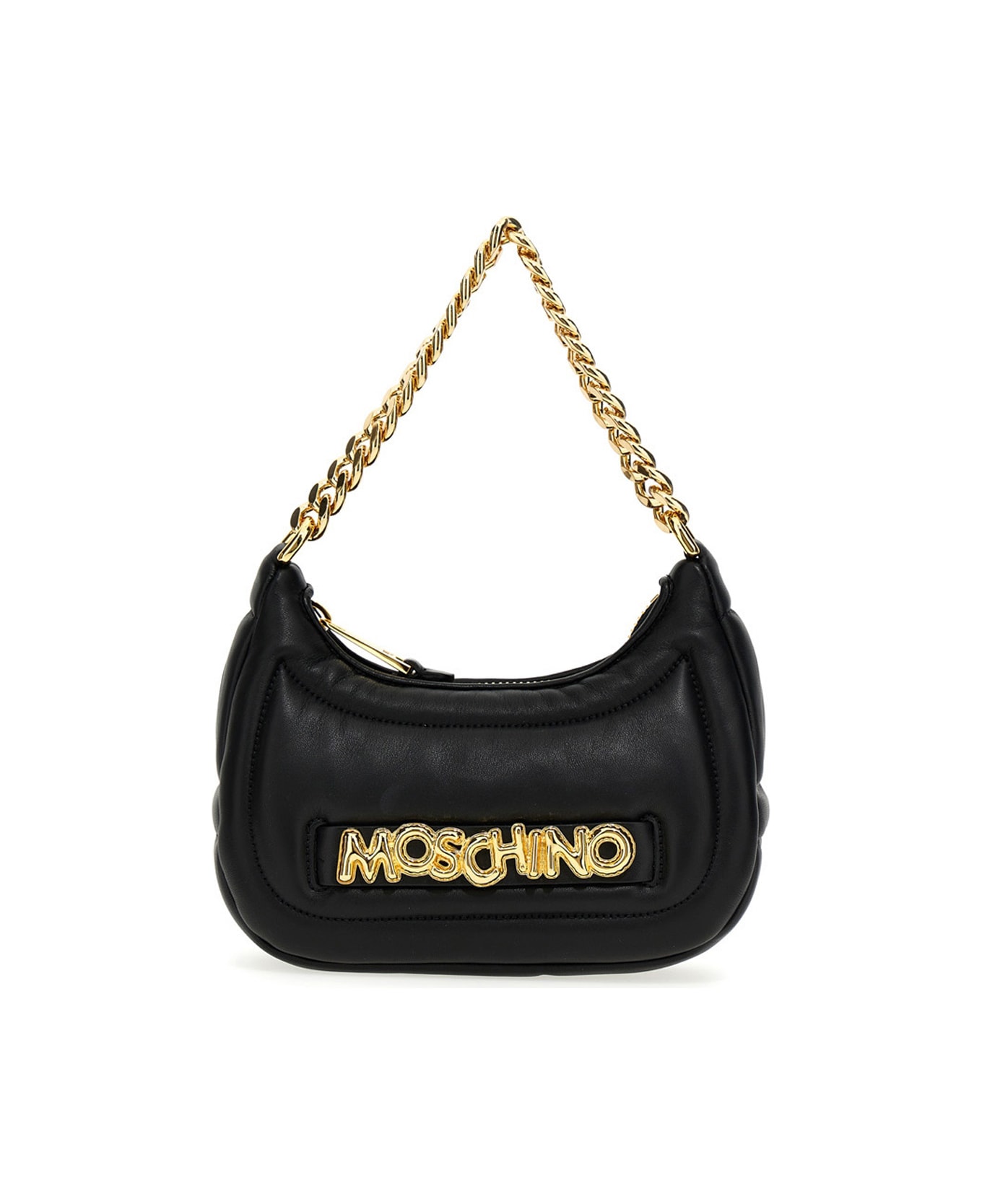 Leather handbag with front metal logo, zip closure, chain handle, adjustable and removable leather shoulder strap. ather shoulder strap.