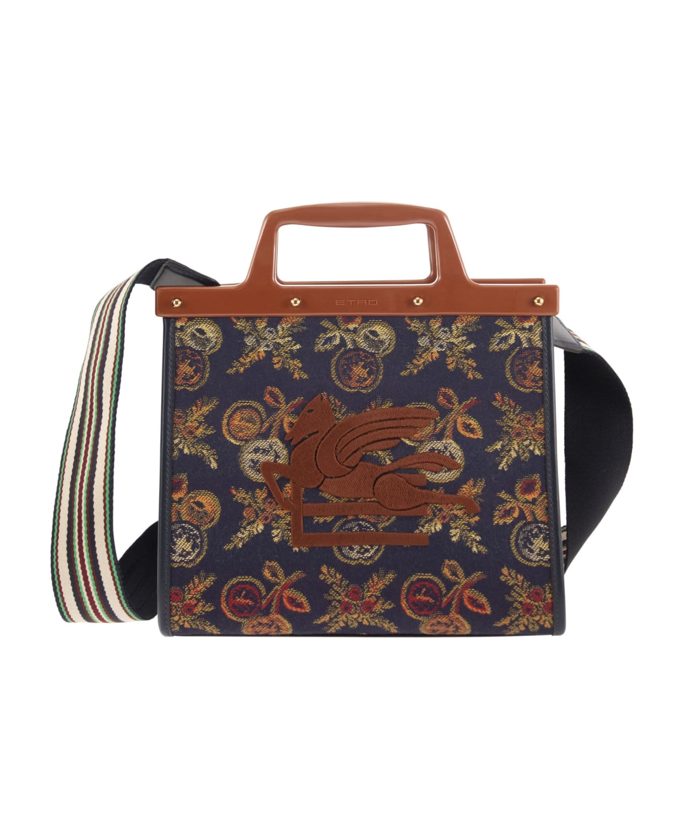 Small Love Trotter shopping bag from the Spring Summer 2023 Fashion Show collection, made of archival jacquard velvet with multicoloured meline. Embellished with the ETRO Pegaso logo embroidered with a three-dimensional effect. Contrasting lining in striped jacquard fabric. Handles are in recycled plastic. - Inside zip pocket - Metal feet - Gold-tone metal hardware - Made in Italy DESIGNER ID: 1P023 7579 202