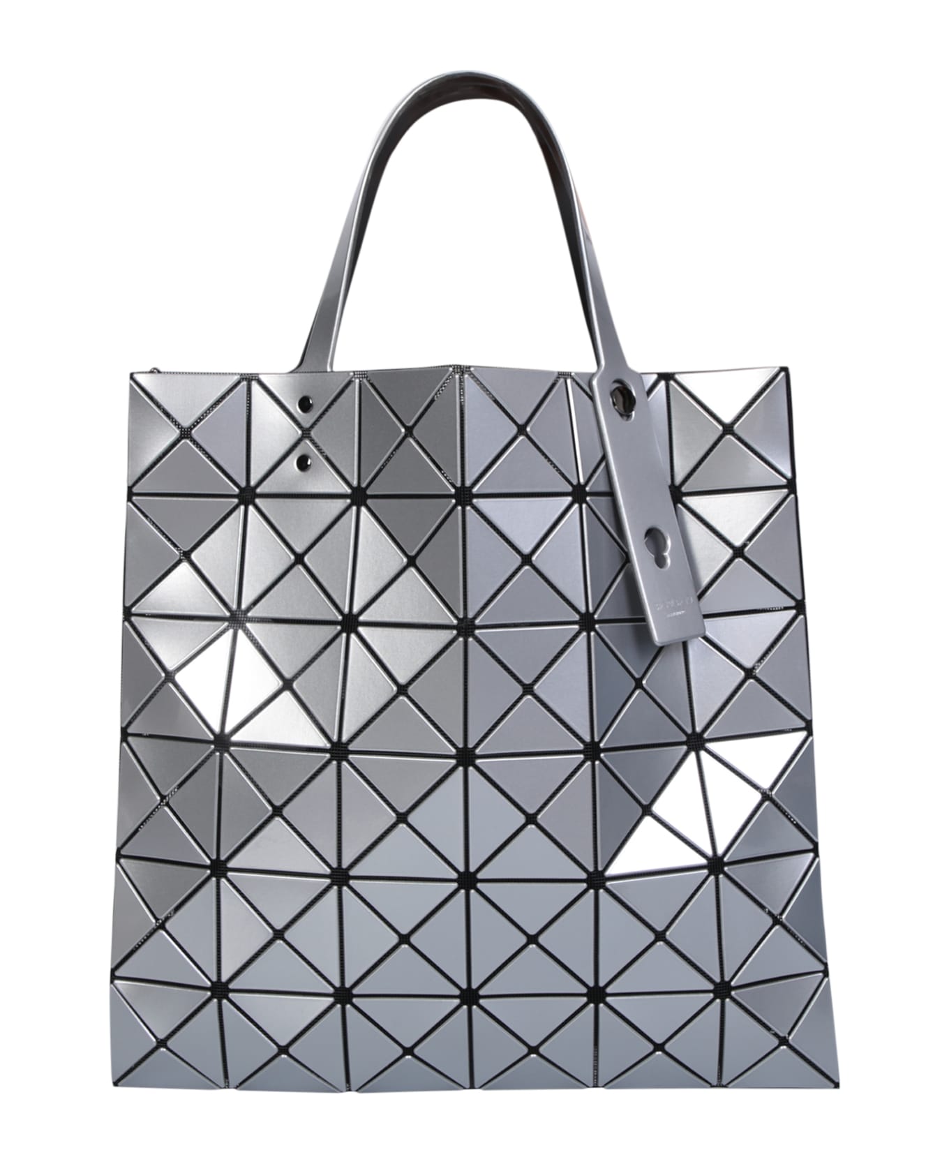 Two top handles. Adjustable handles. Main compartment. Internal logo patch. Full lining. Geometric panelled design. High shine finish. Mesh detailing. Color: silver