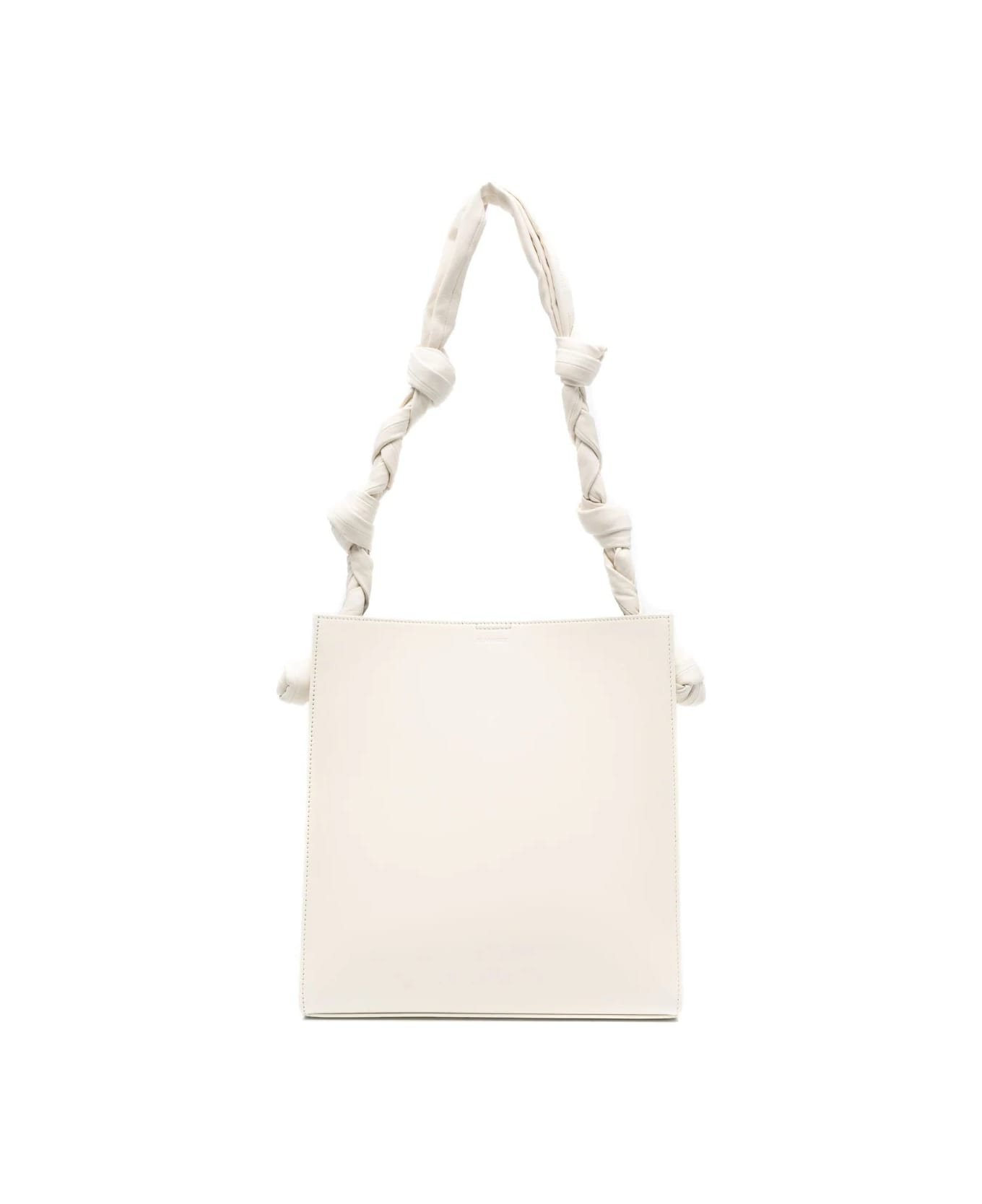 Medium Tangle shoulder bag by Jil Sander made of natural-coloured calf leather and featuring a single main compartment, a snap fastening, a contrasting colour lining, a small embossed logo on the front and a knotted leather shoulder strap.