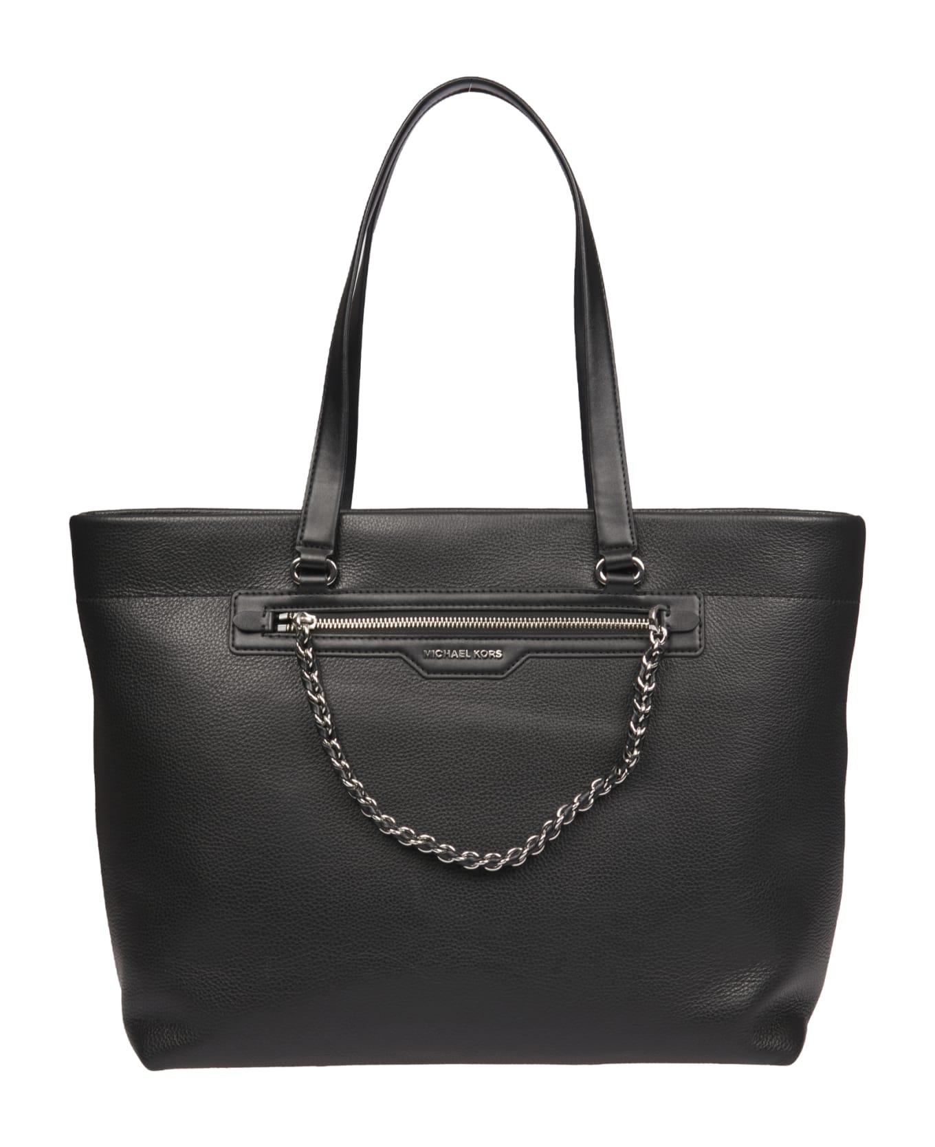 Black Slater model bag with silver-colored metal details. Fixed handles. Pocket with zip and chain on the front. Central zip closure. Internal pocket with zip and 2 patch. Dimensions: height 33 cm, length 40 cm, width 15 cm. Composition:100% leather. Made in Bangladesh.