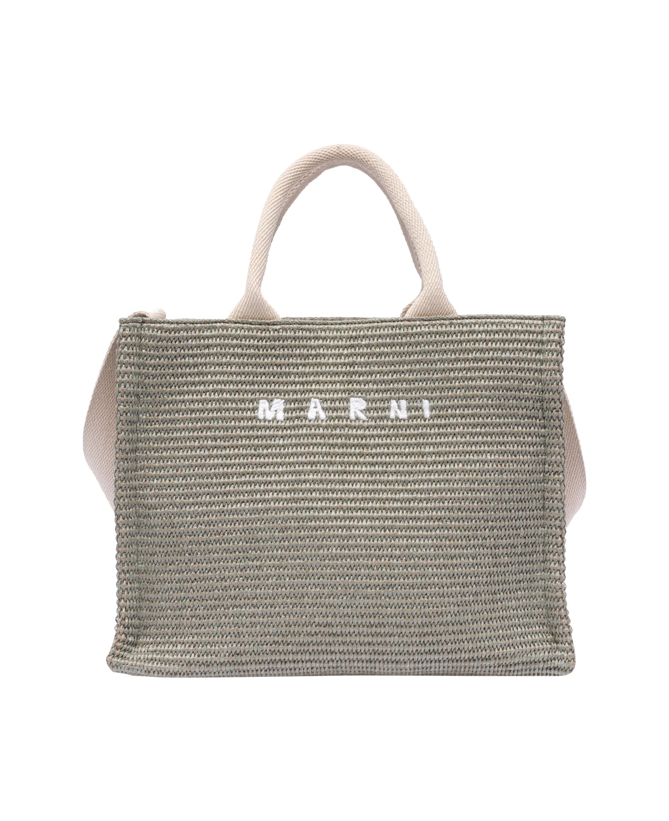 Marni beige Small Rafia effect basket bag with frontal embroidered logo, small model, double handles, laces and button closure, inner zip pocket, shoulder strap Composition: 52% Cotton, 48% Polyamide