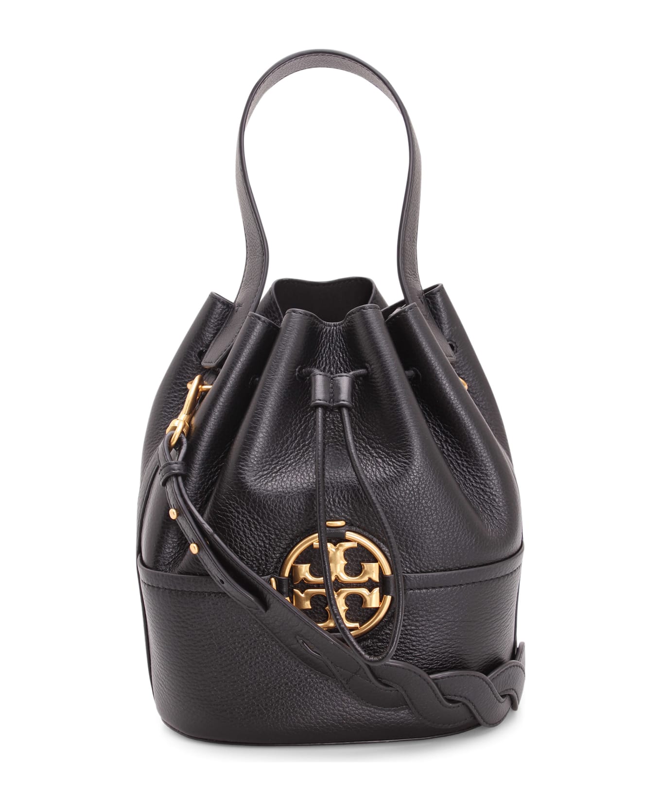 Bucket bag with central logo, drawstring closure, single leather handle and adjustable and removable shoulder strap by Tory Burch