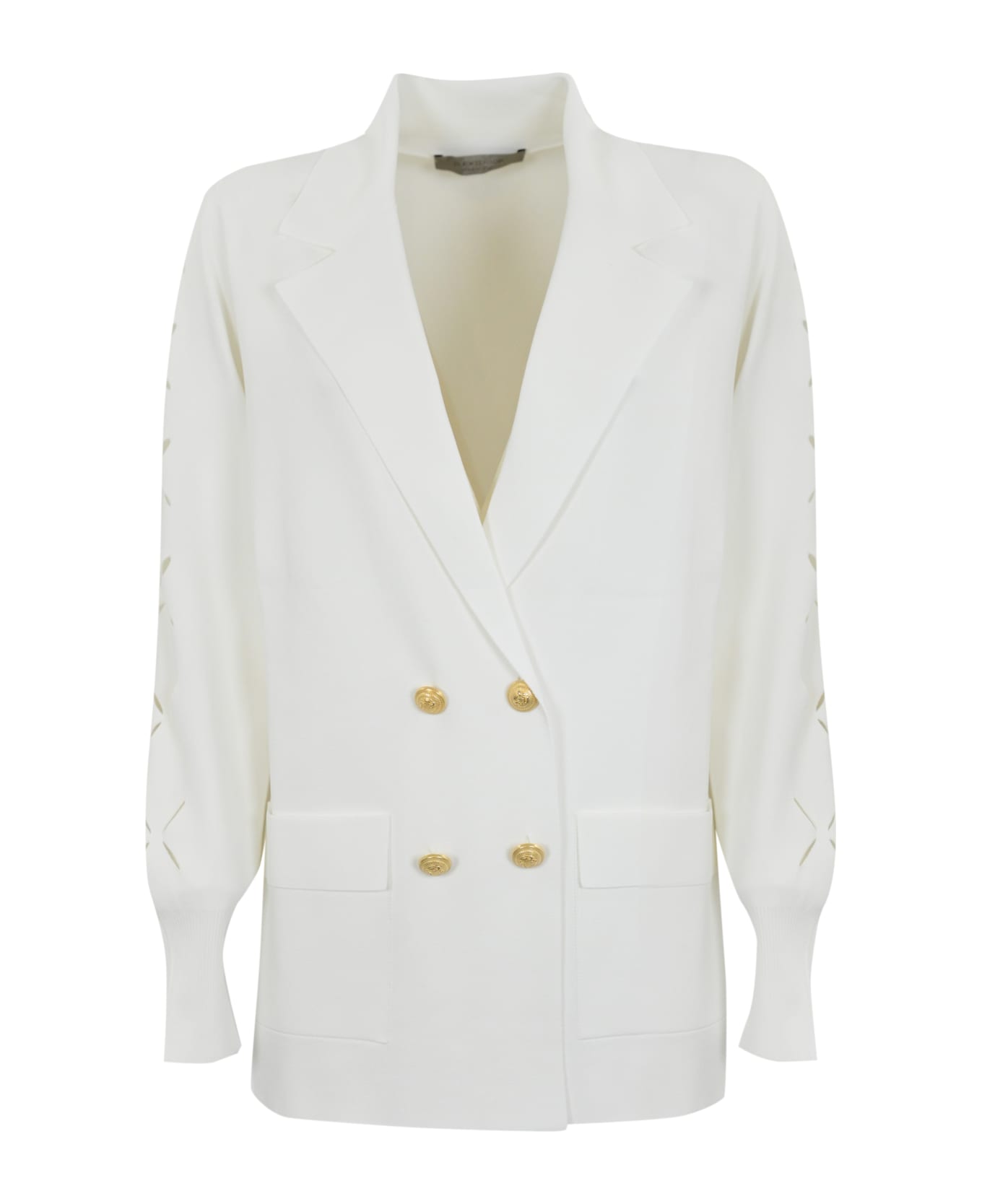 women's viscose jacket: viscose knit long sleeves with laser-cut floral details v-neck with lapels double-breasted closure with gold metal buttons front pockets high ribbed cuffs regular fit composition: 86% viscose, 14% polyester
