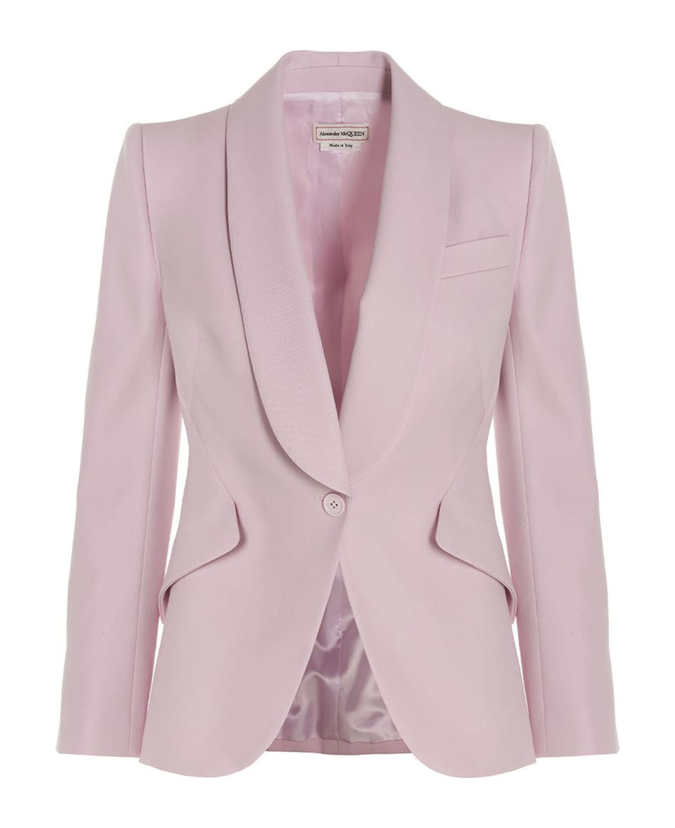 Tailored single breast blazer with grain de poudre wool button closure, shawl lapels, pointed shoulders, chest welt pocket and two side flap pockets.