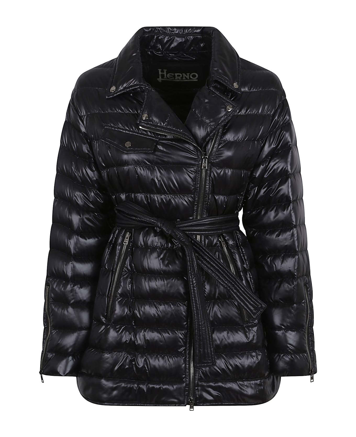 Jacket made from HERNO`s iconic Ultralight Nylon. Down padding; lapel collar; long sleeves; diagonal zip fastening; zipped cuffs; pocket with flap and snap button and zipped pockets; regular fit. Design inspired by the lines of the classic biker jacket, which features a choice of 20 denier Japanese Nylon and a high-quality 90/10 injected down to offer an even lighter feel. The result is good water resistance with a particularly luxurious tactile effect similar to silk. Featuring a matching belt and metal Herno logo on the back.