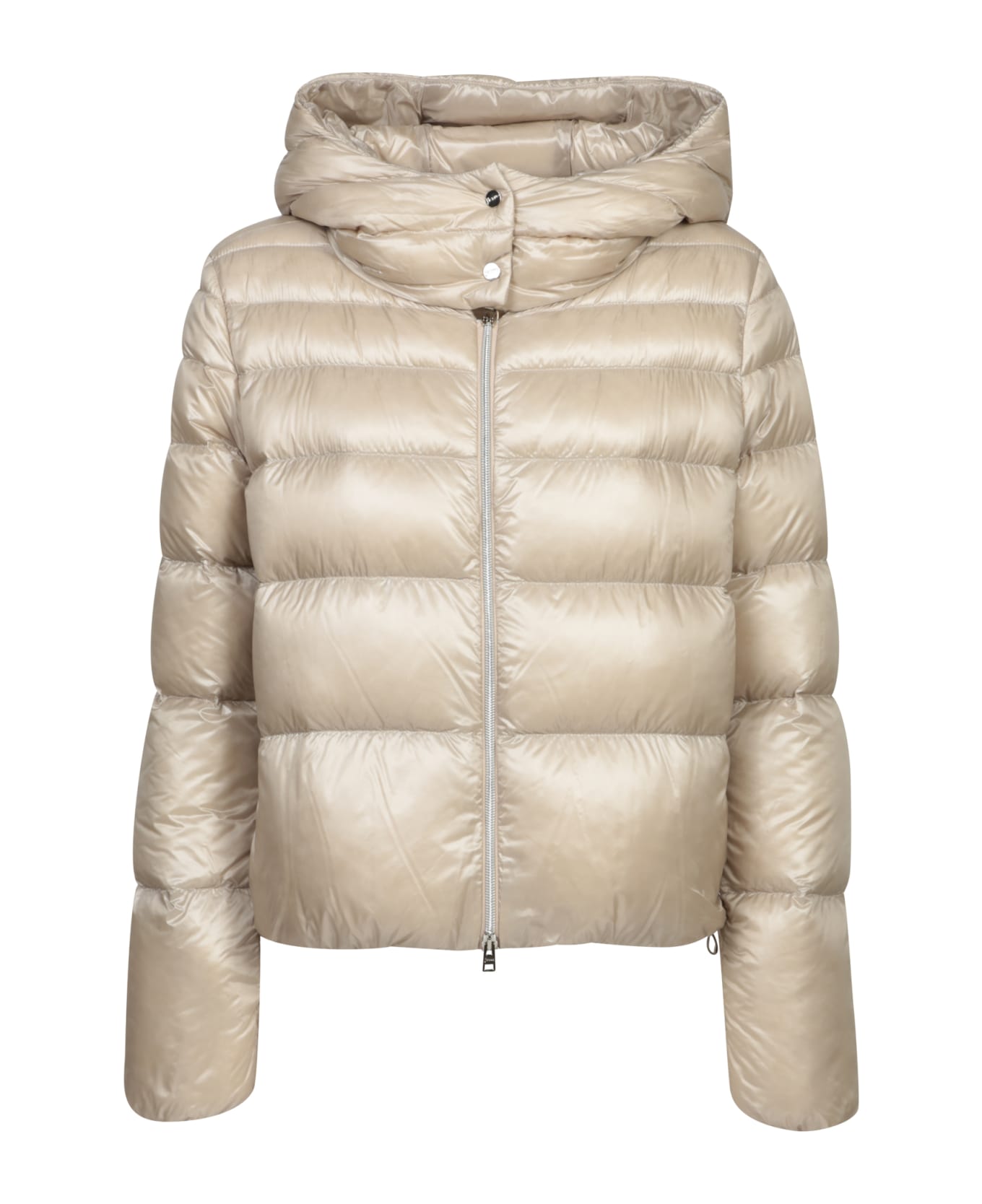 An iconic reinterpretation of the bomber jacket by Herno, this ultra-light beige nylon model features a generous hood and elasticized cuffs for a perfect, comfortable fit, ideal for an urban-chic look.