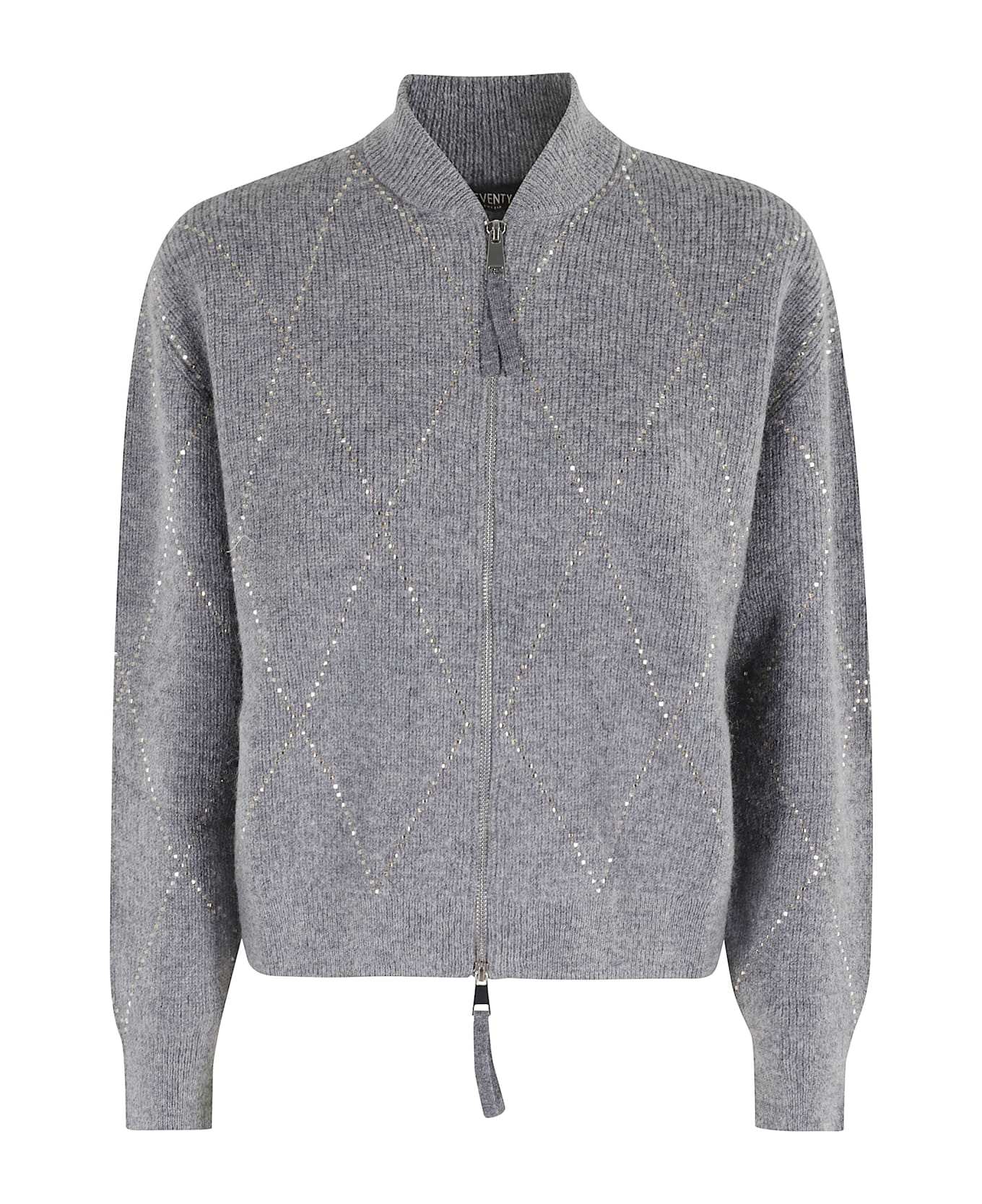 Sweater - Seventy - Jacket model - Light gray color - High collar - Long sleeves - All over rhinestones - Front zipper closure