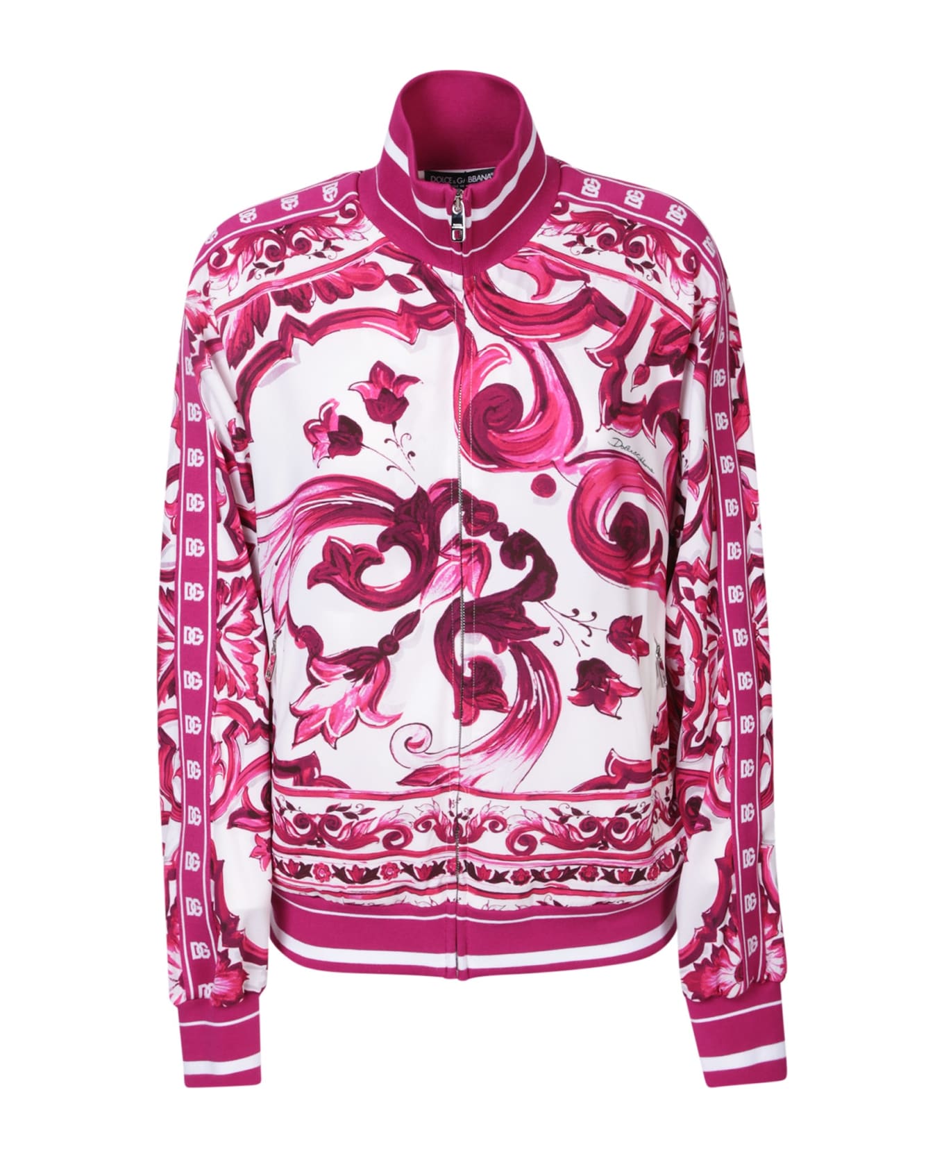 Stand-up neck. Front zip fastening. Long sleeves. Two side pockets. Contrasting details. All-over majolica print. DG logo print to the sleeve. Regular fit. Straight hem. Color: fuxia/ white