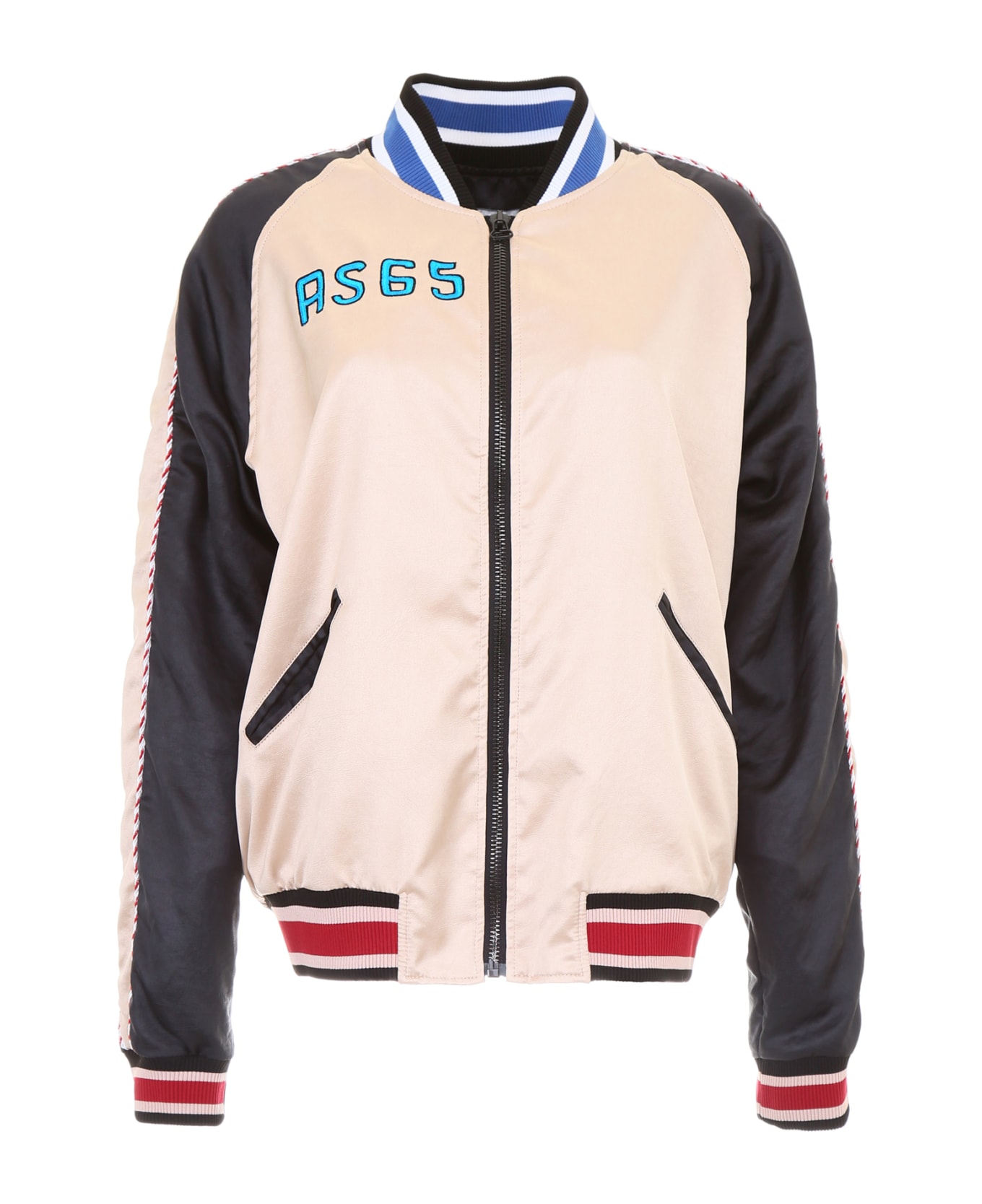 AS65 color block satin bomber jacket with patches and multicolor flamingo embroidery on the back. Fully lined, it has a zip closure and side pockets. Ribbed knit hems with tricolor stripes. Model height is 177 cm and she is wearing a size S.