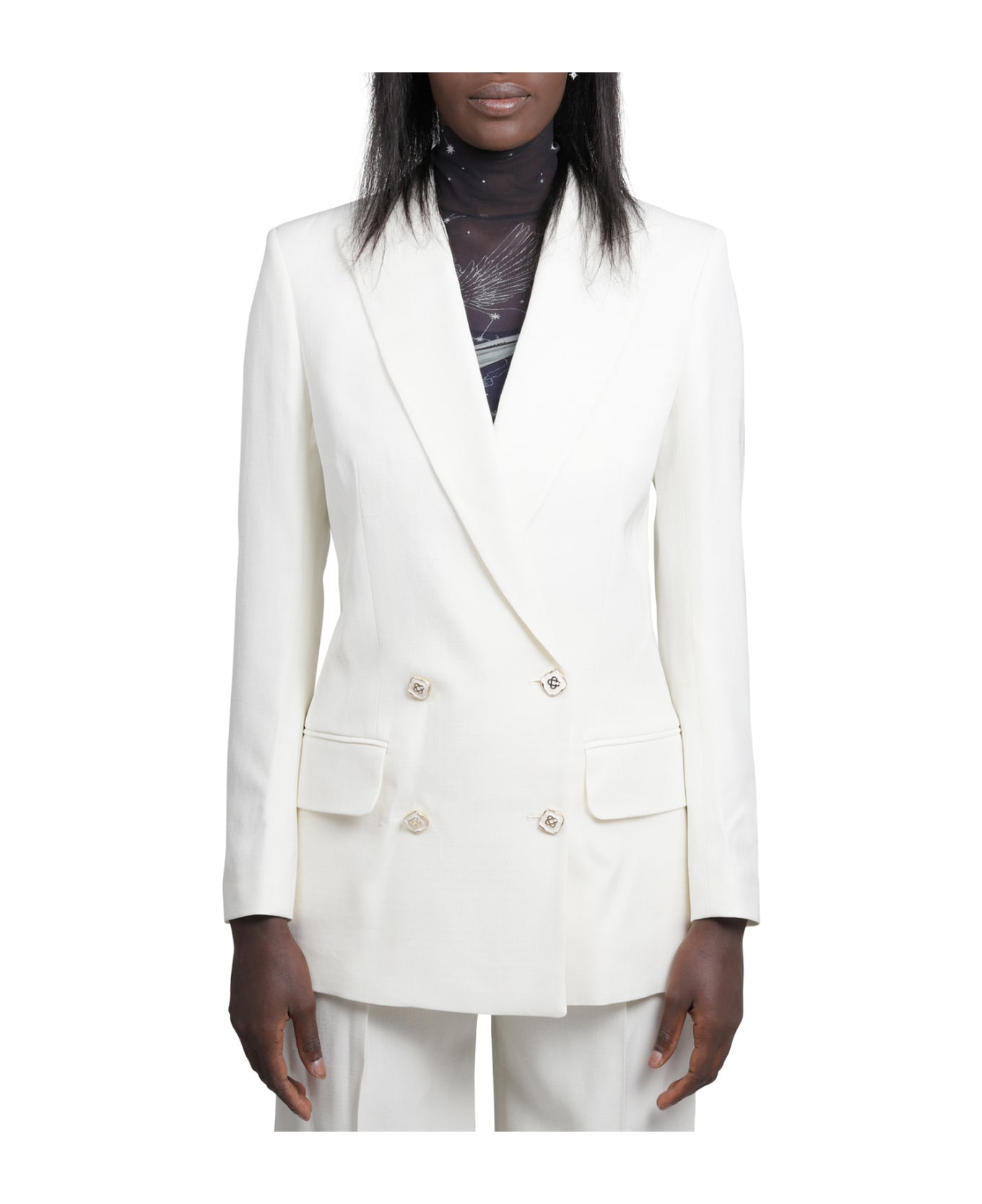 White silk blend double breasted jacket. Long sleeves. Frontal button fastening. Three fake pockets. Notch lapel. Adjustable cuffs with buttons. The model is 181cm and wears size 8 UK. Main: 57% viscose, 43% silk. Lining 1: 52% viscose, 48 cotton. Lining 2: 100% cotton. Made in Portugal. Designer colour: OFF-WHITE