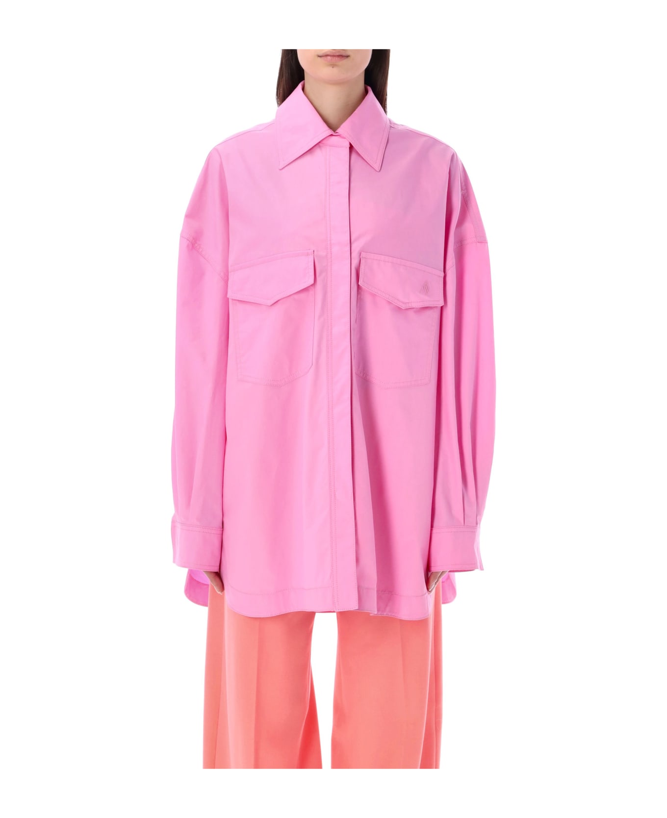 Cotton Shirt Jacket By The Attico. Featuring: Point Collar Concealed Snap Button Fastening Oversize Fit Flap Pockets At Chest Tonal Logo Embroidery At Left Pocket Long Sleeves With Buttoned Cuffs Curved Hem Model Is 1,72 M Tall And She Is Wearing Size 40