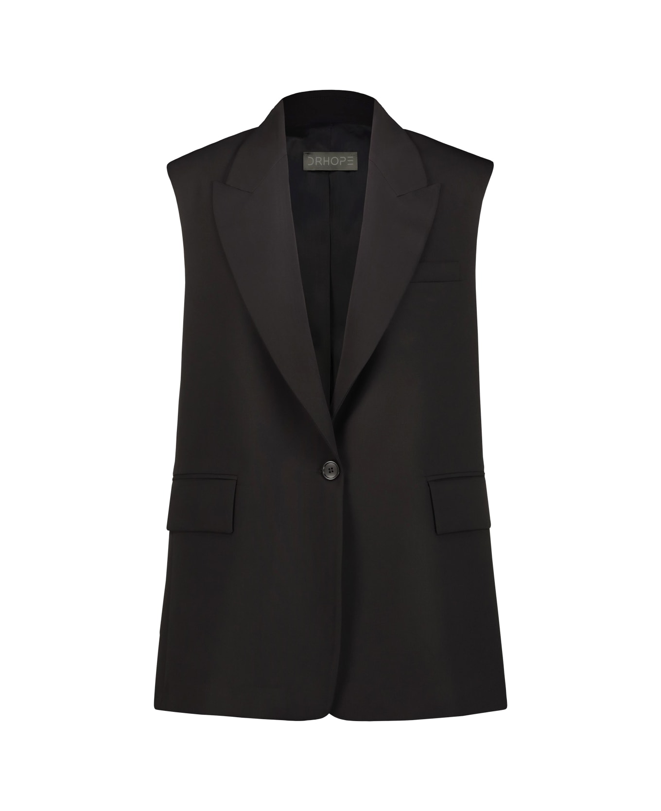 Drhope sleeveless blazer vest with peak neck, flap pockets, center back vent. GTIN CODE: 433798