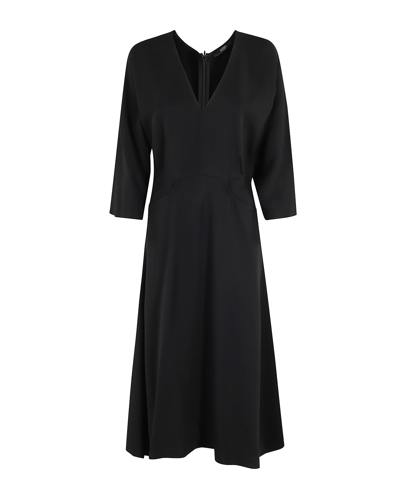 Dress - Seventy - Black color - Cady crepe fabric - V-neck - Short kimono sleeve - Side pockets - Flared midi skirt - Back zipper closure - Regular fit
