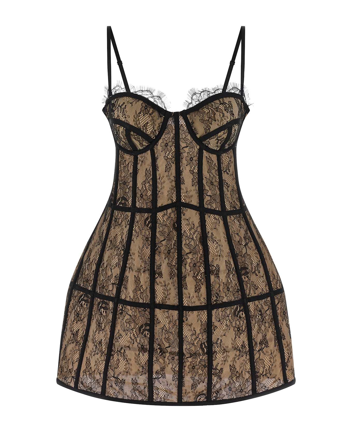 Lace mini dress with contrasting grosgrain cues, rigid off-the-shoulder bustier style with preformed cups and inner slats, thin adjustable and removable straps, sleeveless, back zip closure, lining.