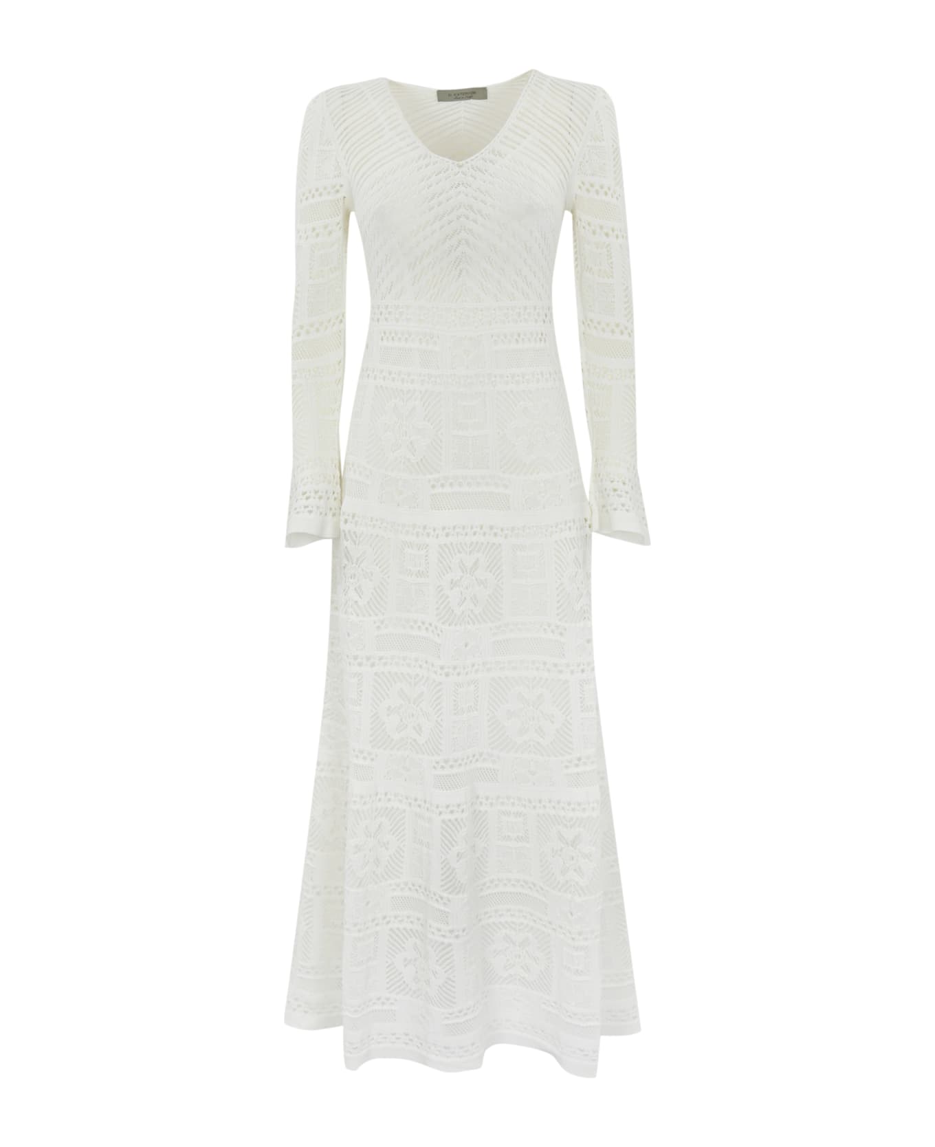 women's long dress: cotton yarn long sleeves v-neck crochet workmanship patchwork design inner lining slim fit composition: 80% cotton, 20% polyamide lining: 100% polyamide