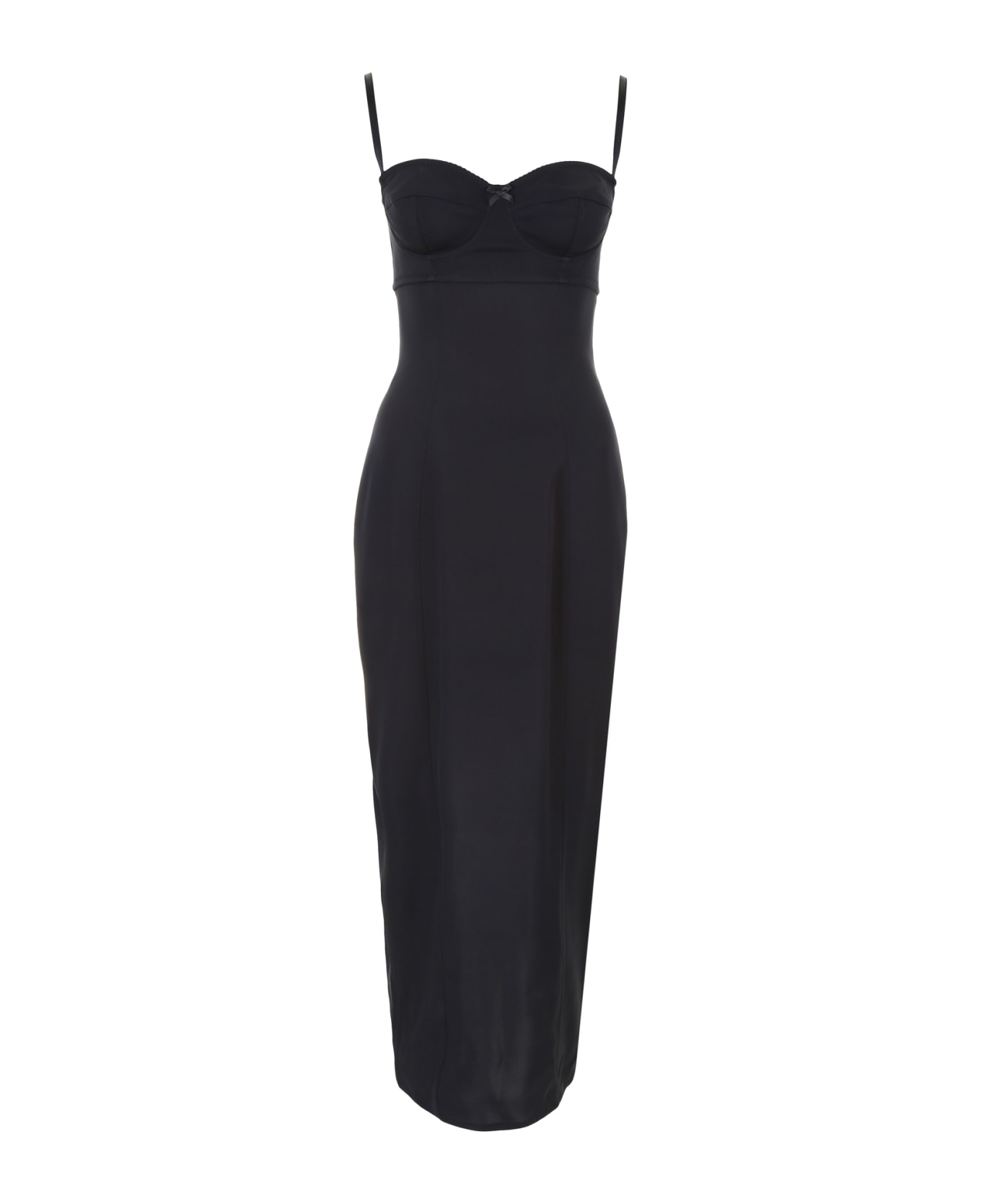 Dolce & Gabbana long silk crepe dress with adjustable elastic shoulder staps. Back hook closure. Model height is 177 cm and she is wearing a size IT 40.