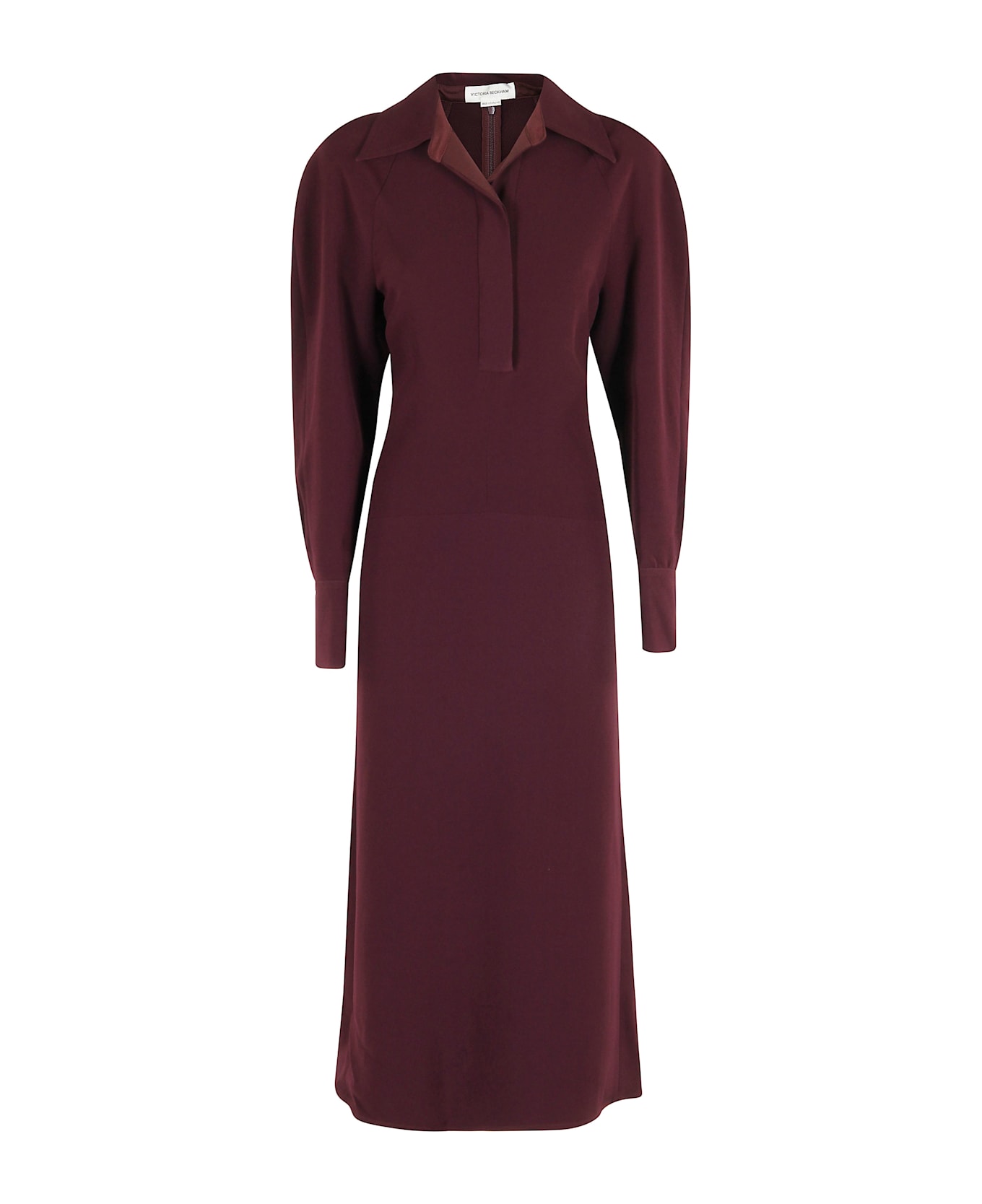 Dress - Victoria Beckham - Merlot color - Polo collar with buttons - Long sleeve - Flowing midi skirt - Asymmetric hemline - Regular fit