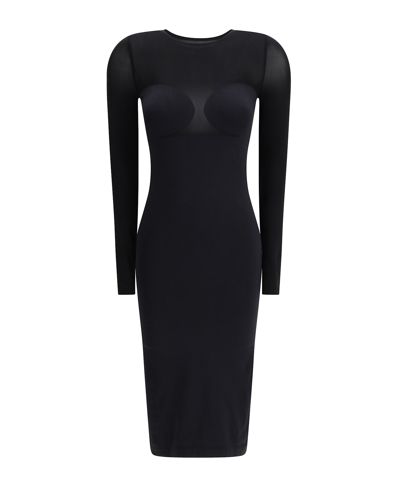 The midi bustier dress by wolford is an elegant and seductive garment with a fitted design that emphasizes the silhouette. the slip-on style makes the dress easy to wear, while the crew neck and long sleeves add a touch of sophistication. the semi-sheer fabric creates a sensual yet sophisticated effect, perfect for special occasions or elegant evenings. a perfect blend of comfort and style, this dress is ideal for those looking for a modern, elegant look with a touch of boldness.