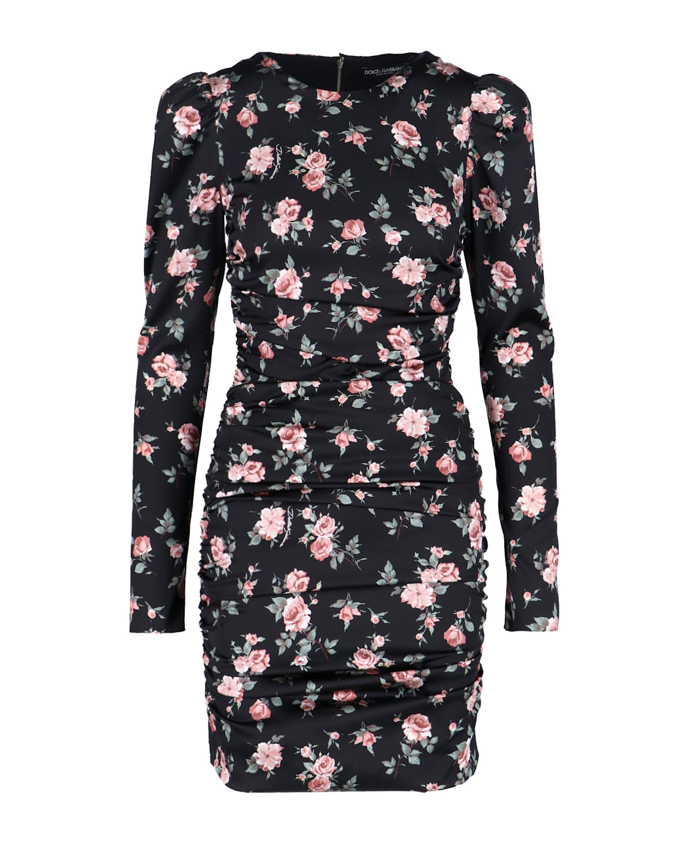Dolce & Gabbana black silk mini dress with all-over floral print, round neckline, back zip closure, long sleeves, crinkled details, straight hem. Composition: 93% Silk, 7% Elastane