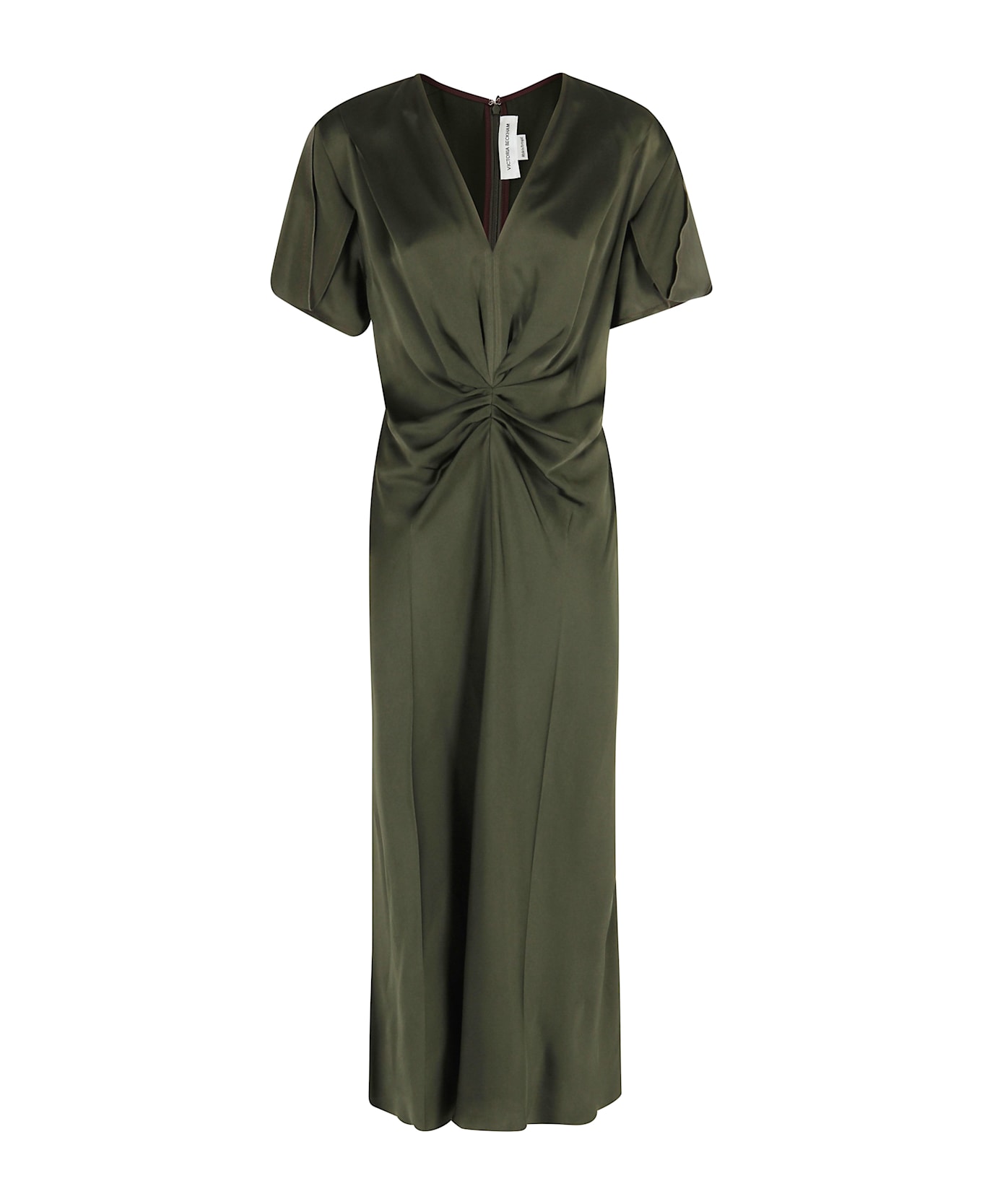 Midi dress -Victoria Beckham -Dark olive color -Short sleeve -V-neck -Front placket -Back zipper closure