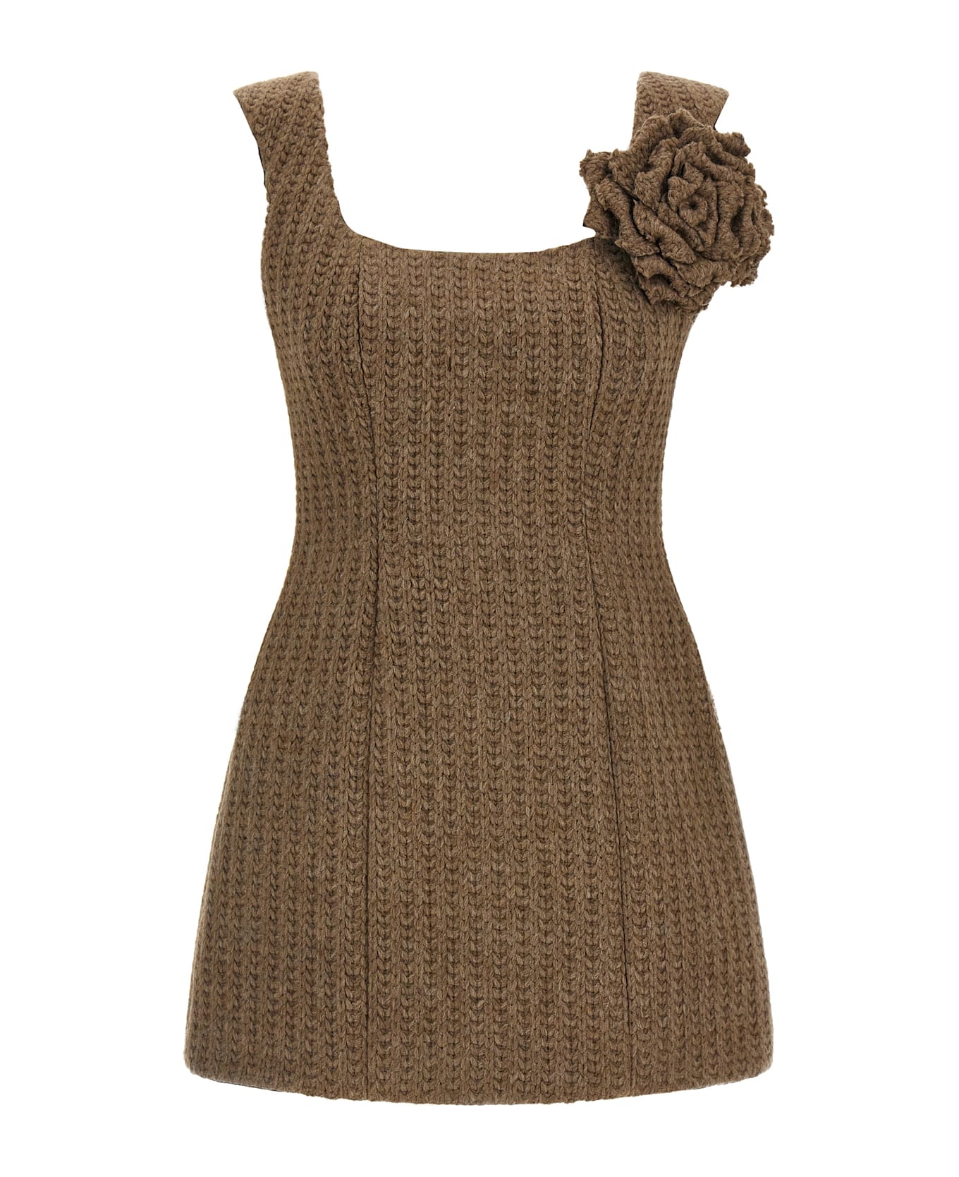 Knitted wool mini dress with round neckline, shoulder straps, removable brooch detail.