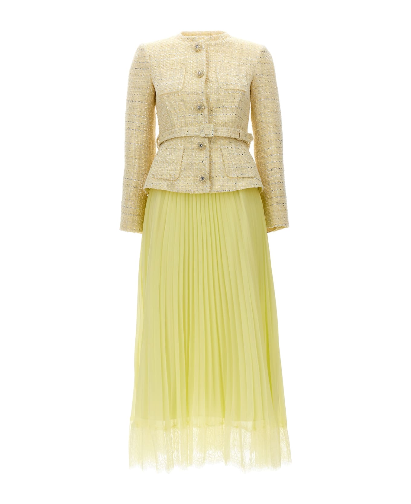 Yellow Boucle Midi dress in bouclé fabric with jewel button appliqué, button closure, long sleeves, pleated chiffon skirt with back zipper closure, and matching belt. Two pieces that can be attached via buttons.