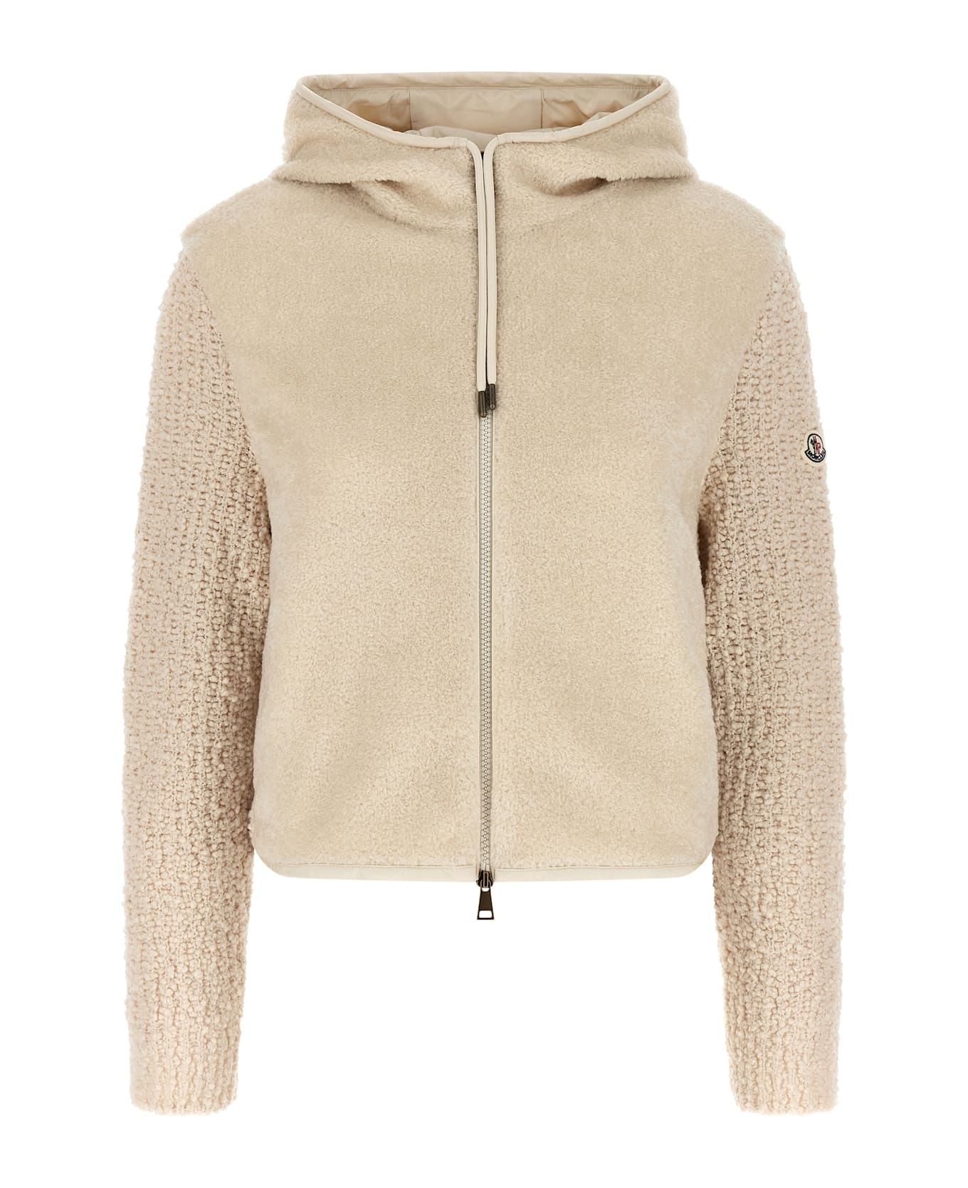 Tricot bimaterial cotton blend cardigan with hood and drawstring, fur-effect front panels, nylon lining, front zip closure, side pockets, knitted sleeves with side logo patch.